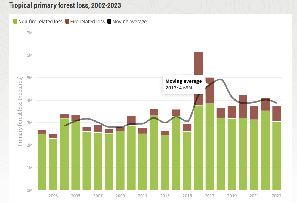 Tổng diện tích rừng nguyên sinh nhiệt đới bị mất vào năm 2023 là 3,7 triệu ha, tương đương với việc mất gần 10 sân bóng đá (bóng đá) rừng mỗi phút. Mặc dù con số này giảm 9% so với năm 2022, nhưng tỷ lệ vào năm 2023 gần giống với năm 2019 và 2021. Tất cả sự mất mát rừng này đã tạo ra 2,4 gigaton (Gt) lượng khí thải carbon dioxide vào năm 2023, tương đương gần một nửa lượng khí thải nhiên liệu hóa thạch hàng năm của Hoa Kỳ.