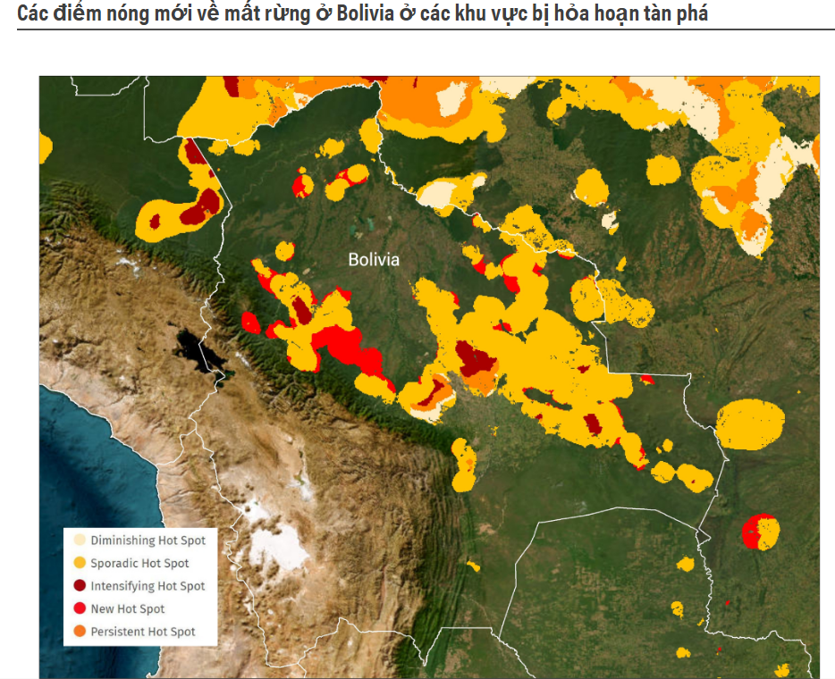 Tại Bolivia, diện tích rừng nguyên sinh bị mất tăng 27%, đạt mức cao nhất trong năm thứ ba liên tiếp. Bolivia là quốc gia có diện tích rừng nguyên sinh bị mất nhiều thứ ba trong số các quốc gia nhiệt đới, mặc dù diện tích rừng của nước này chỉ bằng một nửa so với Cộng hòa Dân chủ Congo hoặc Indonesia. Cháy rừng vẫn tiếp tục đóng vai trò chính trong cả nước, chiếm hơn một nửa (51%) diện tích rừng nguyên sinh bị mất vào năm 2023. Cháy rừng ở các quốc gia nhiệt đới như Bolivia thường do con người gây ra vì mục đích nông nghiệp, chẳng hạn như tái tạo đồng cỏ để chăn thả gia súc và khai hoang đất canh tác hoặc để chiếm đất. Trong điều kiện nóng và khô, những đám cháy này có thể lan rộng không kiểm soát vào các khu vực có rừng. Bolivia đã trải qua đợt nắng nóng kỷ lục vào năm 2023 do sự kết hợp giữa biến đổi khí hậu do con người gây ra và hiện tượng El Niño tự nhiên. Năm 2023, tình trạng mất rừng do cháy rừng phổ biến nhất ở tỉnh Beni, nơi có tỷ lệ mất rừng nguyên sinh cao gấp đôi so với năm 2022. Cháy rừng một lần nữa lại xảy ra phổ biến trong Công viên Noel Kempff Mercado và các khu bảo tồn khác trong cả nước.