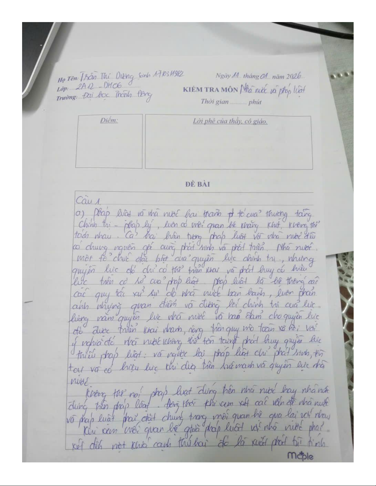 Bài kiểm tra môn Nhà nước và pháp luật | Trường Đại học Hải Phòng