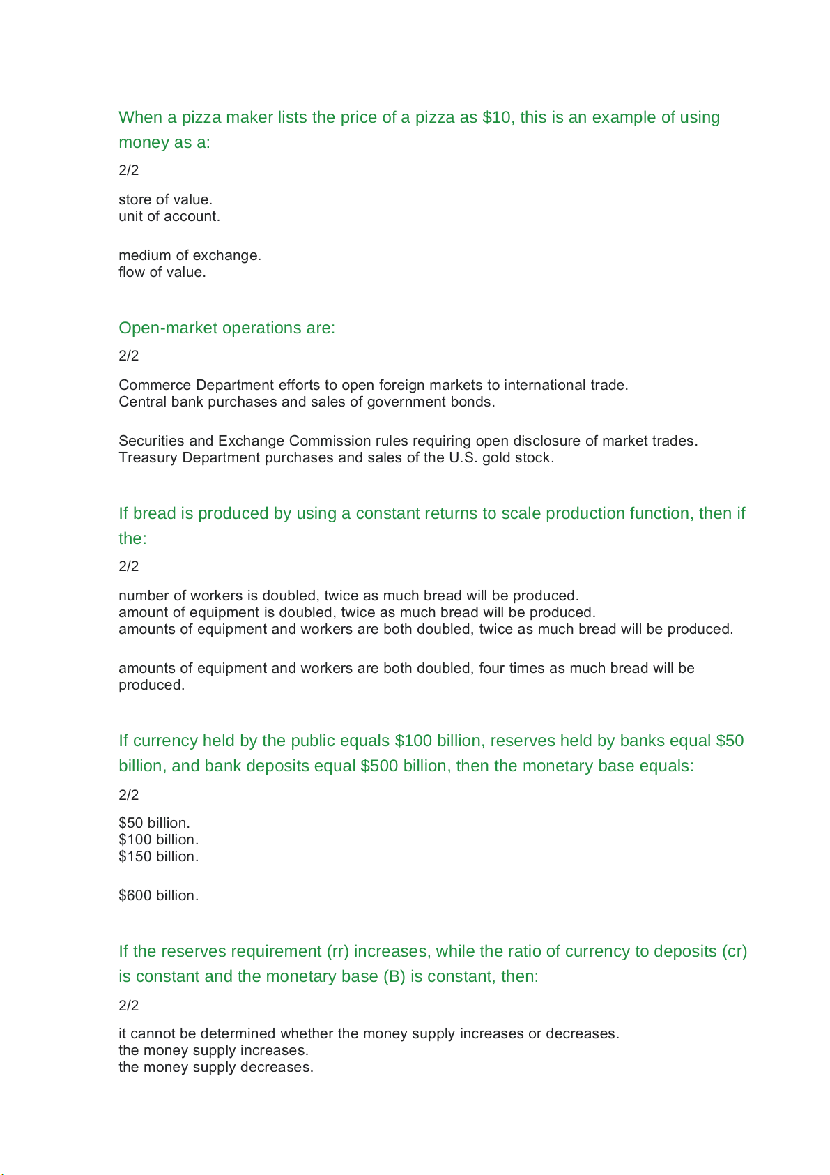 When a pizza maker lists the price of a pizza as $10, this is an example of using money as a: 2/2 store of value. unit of account. medium of exchange. flow of value. Open-market operations are: 2/2