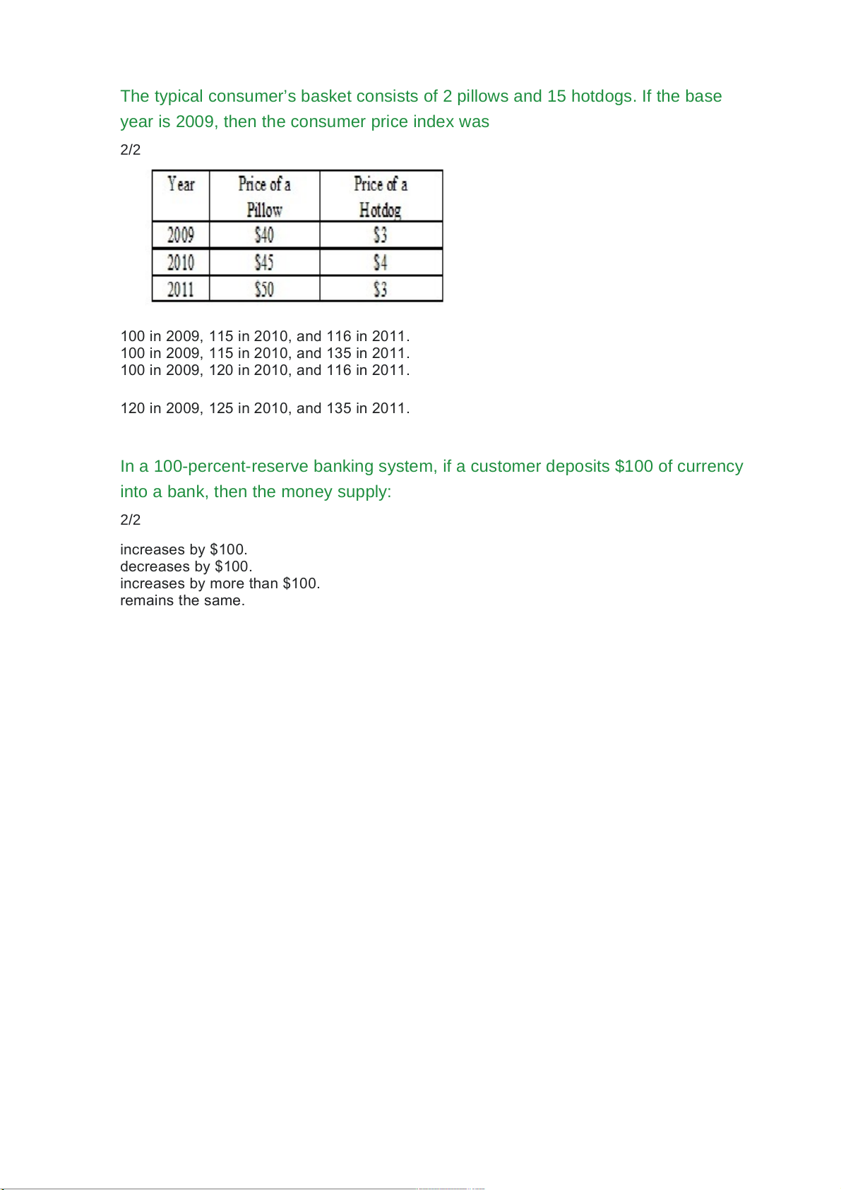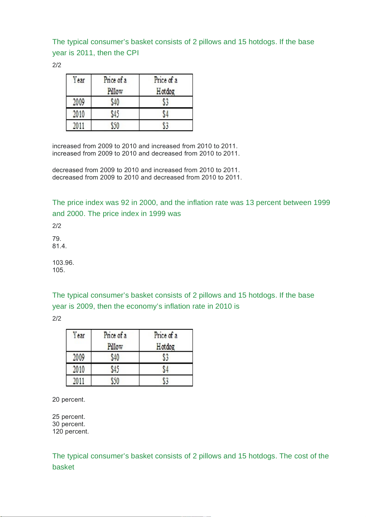 The typical consumer’s basket consists of 2 pillows and 15 hotdogs. If the base year is 2011, then the CPI 2/2