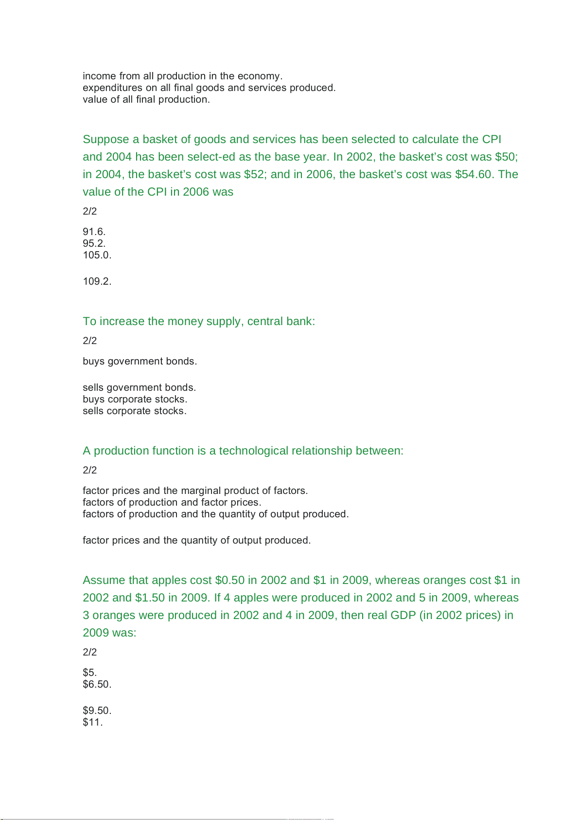 3 oranges were produced in 2002 and 4 in 2009, then real GDP (in 2002 prices) in 2009 was: 2/2 $5. $6.50. $9.50. $11.