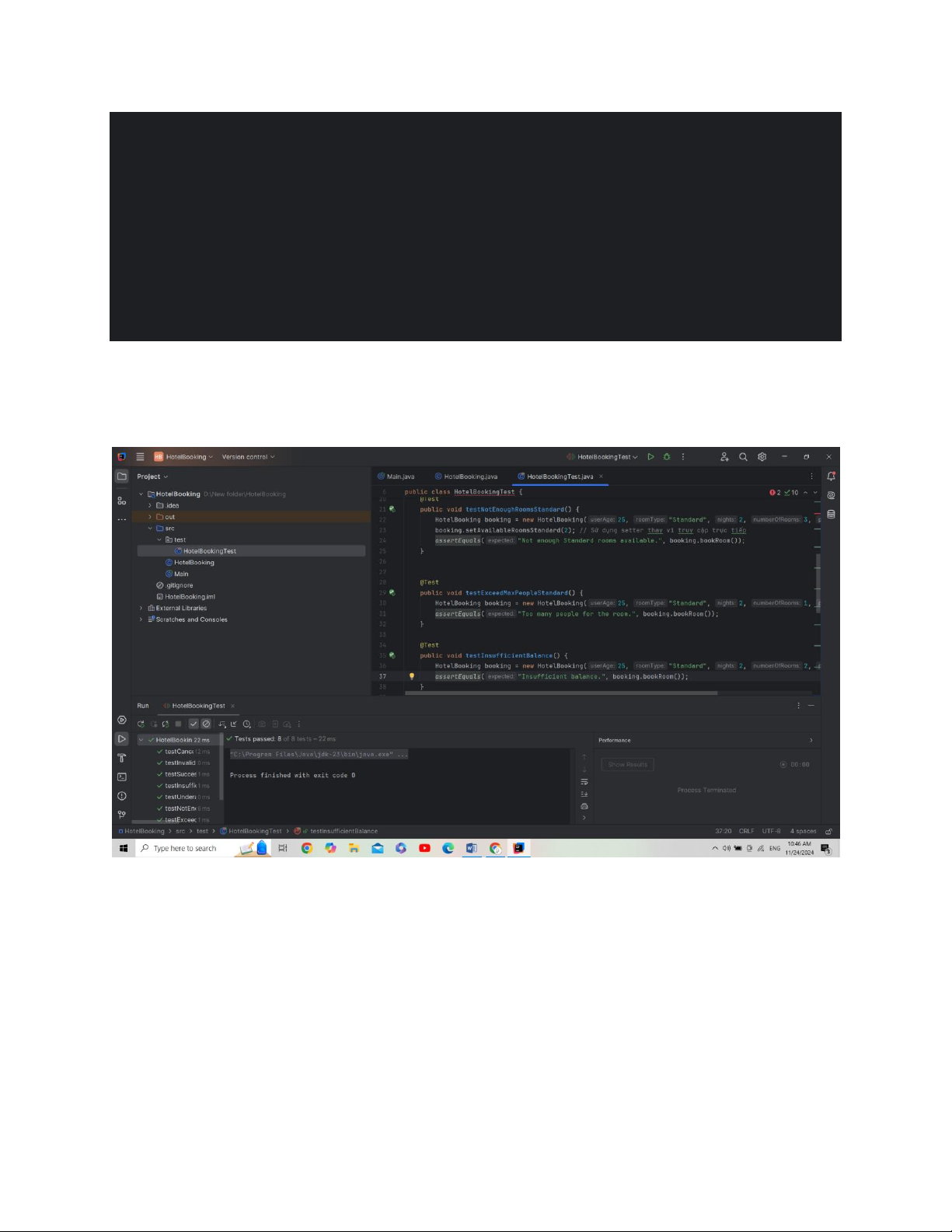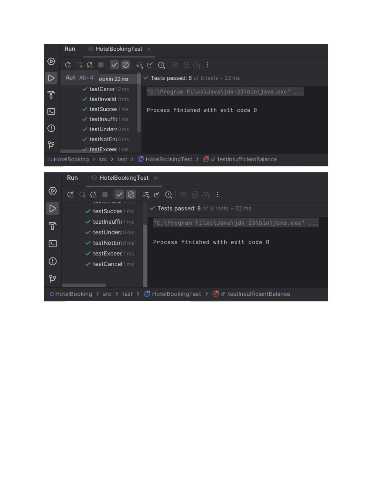 assertEquals("Invalid cancellation request.", booking.cancelRoom(3)); } } Kết quả FoodOrder import java.util.List; public class FoodOrder { private List items; private List quantities; private double totalAmount; private boolean isPaid;