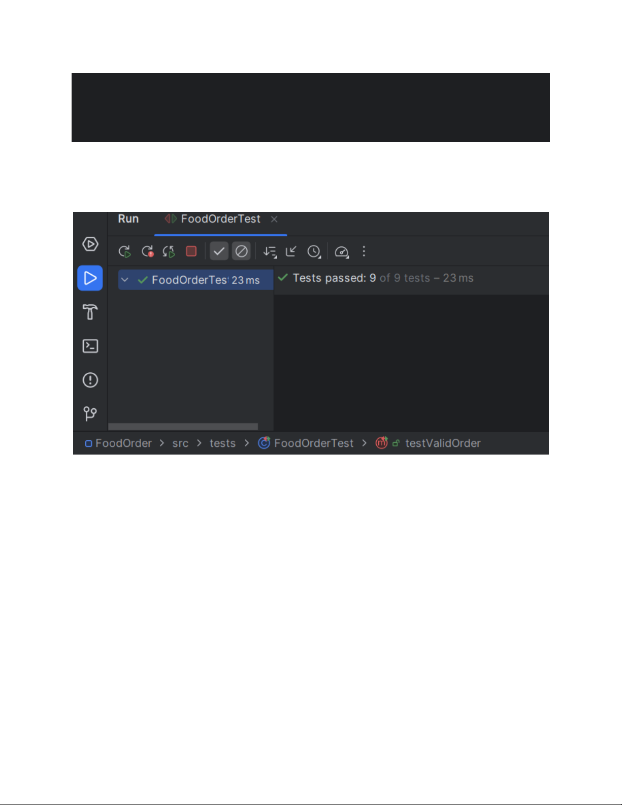 assertEquals("Order placed successfully!", order.placeOrder()); } } Kết quả