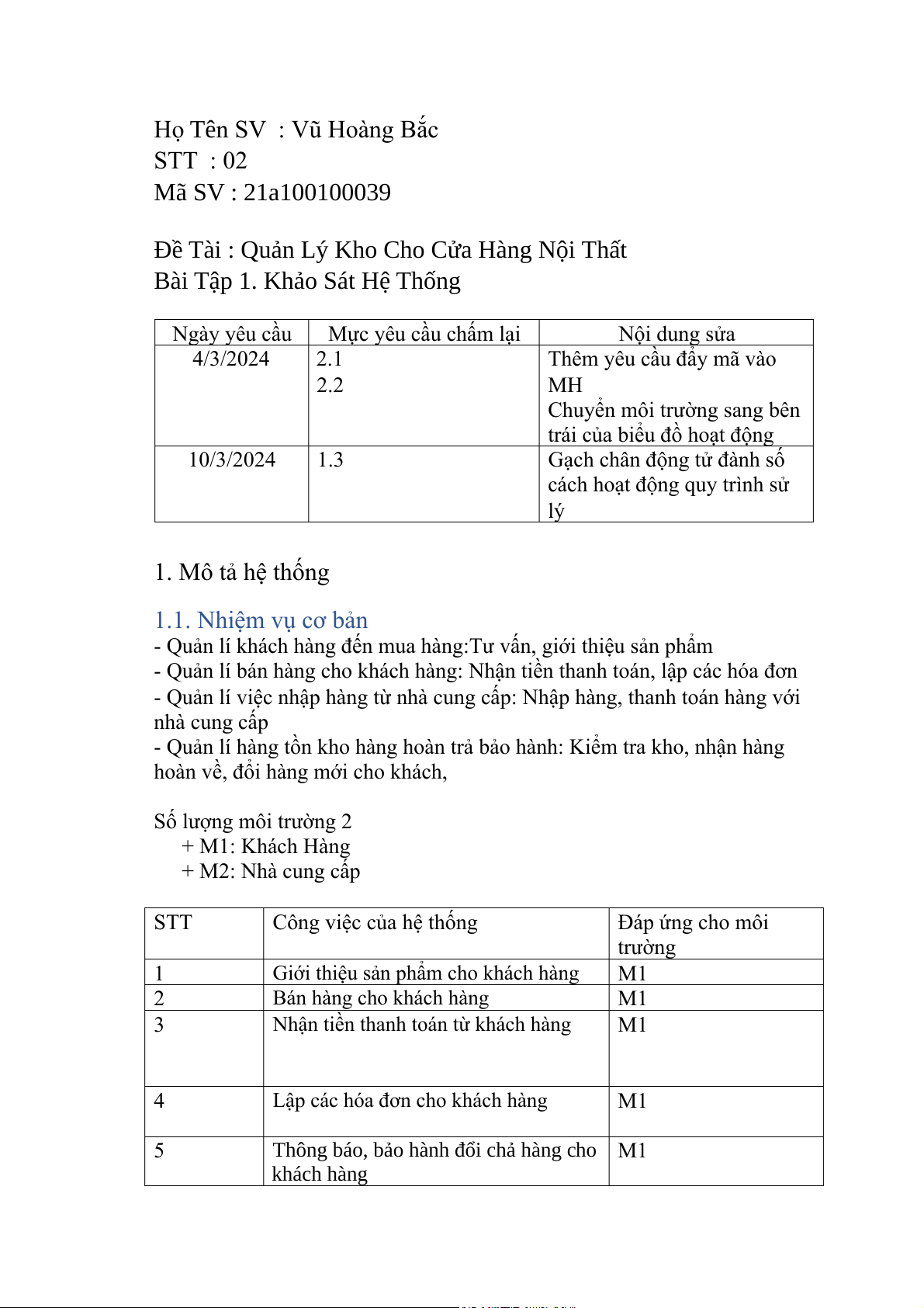 Bài Tập 1. Khảo Sát Hệ Thống Ngày yêu cầu Mực yêu cầu chấm lại Nội dung sửa 4/3/2024 2.1