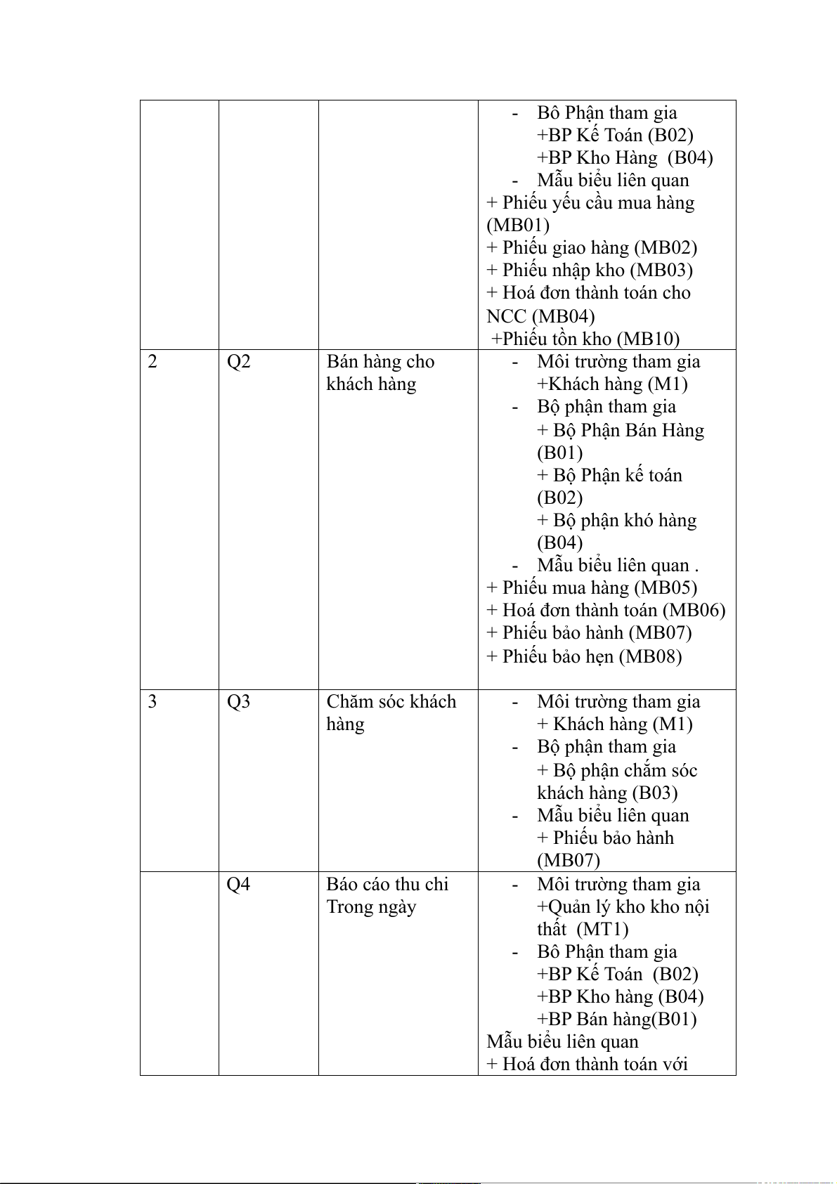 + Hoá đơn thành toán (MB06) + Phiếu bảo hành (MB07) + Phiếu bảo hẹn (MB08) 3 Q3 Chăm sóc khách - Môi trường tham gia hàng + Khách hàng (M1) - Bộ phận tham gia + Bộ phận chắm sóc khách hàng (B03) - Mẫu biểu liên quan + Phiếu bảo hành (MB07) Q4 Báo cáo thu chi - Môi trường tham gia Trong ngày +Quản lý kho kho nội thất (MT1) - Bô Phận tham gia +BP Kế Toán (B02) +BP Kho hàng (B04) +BP Bán hàng(B01) Mẫu biểu liên quan