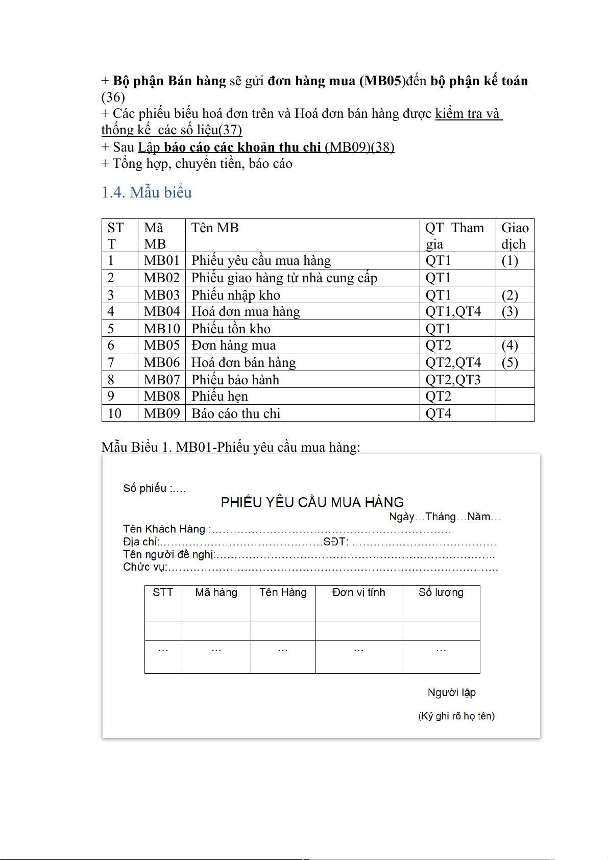 + Phiếu yếu cầu mua hàng (MB01) + Phiếu giao hàng (MB02) + Phiếu nhập kho (MB03) + Hoá đơn thành toán cho NCC (MB04) +Phiếu tồn kho (MB10) 2 Q2 Bán hàng cho - Môi trường tham gia khách hàng +Khách hàng (M1) - Bộ phận tham gia + Bộ Phận Bán Hàng (B01) + Bộ Phận kế toán (B02) + Bộ phận khó hàng (B04) - Mẫu biểu liên quan . + Phiếu mua hàng (MB05)