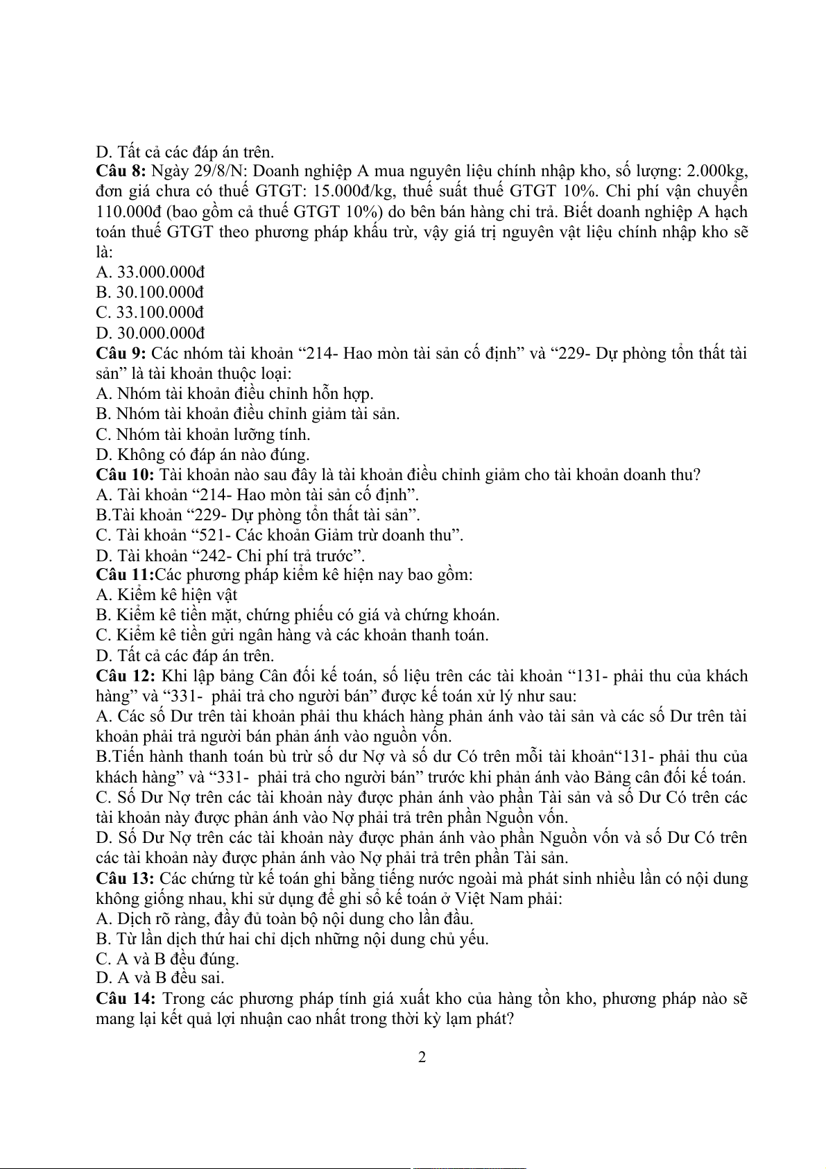 Câu 8: Ngày 29/8/N: Doanh nghiệp A mua nguyên liệu chính nhập kho, số lượng: 2.000kg,