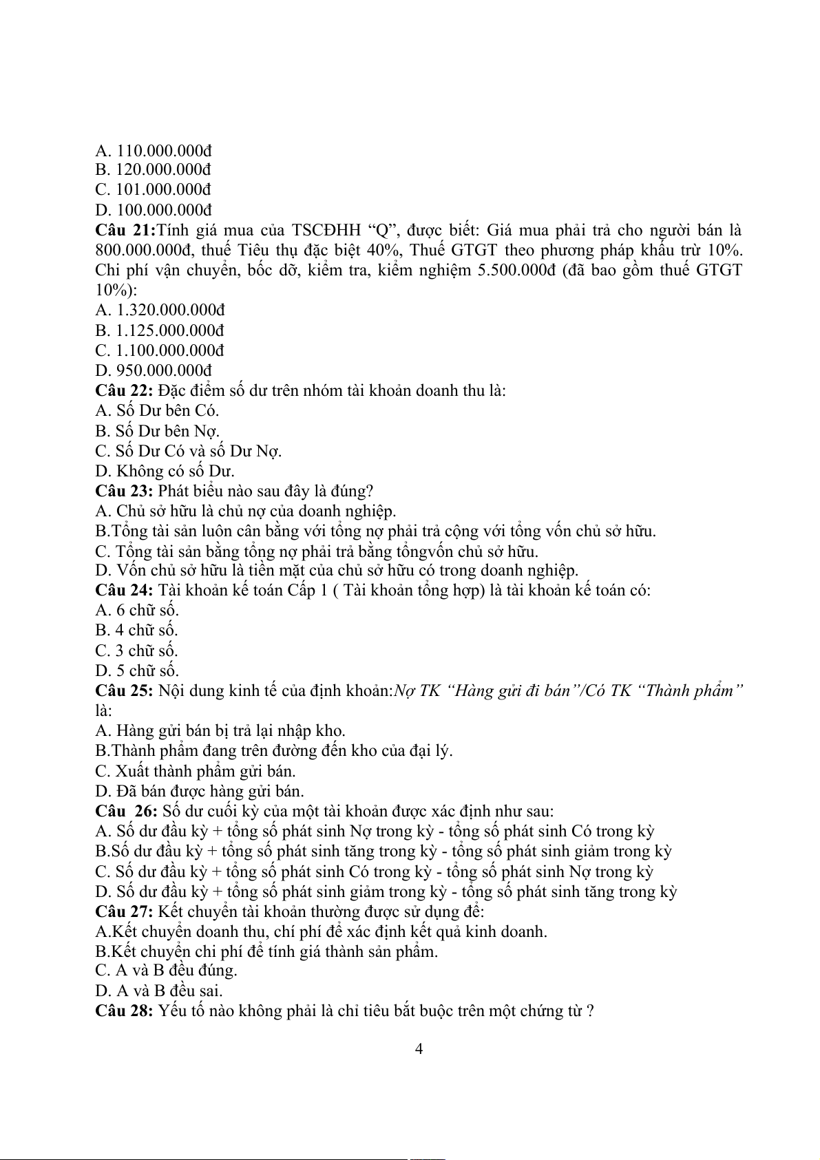 Câu 24: Tài khoản kế toán Cấp 1 ( Tài khoản tổng hợp) là tài khoản kế toán có: A. 6 chữ số. B. 4 chữ số. C. 3 chữ số. D. 5 chữ số.