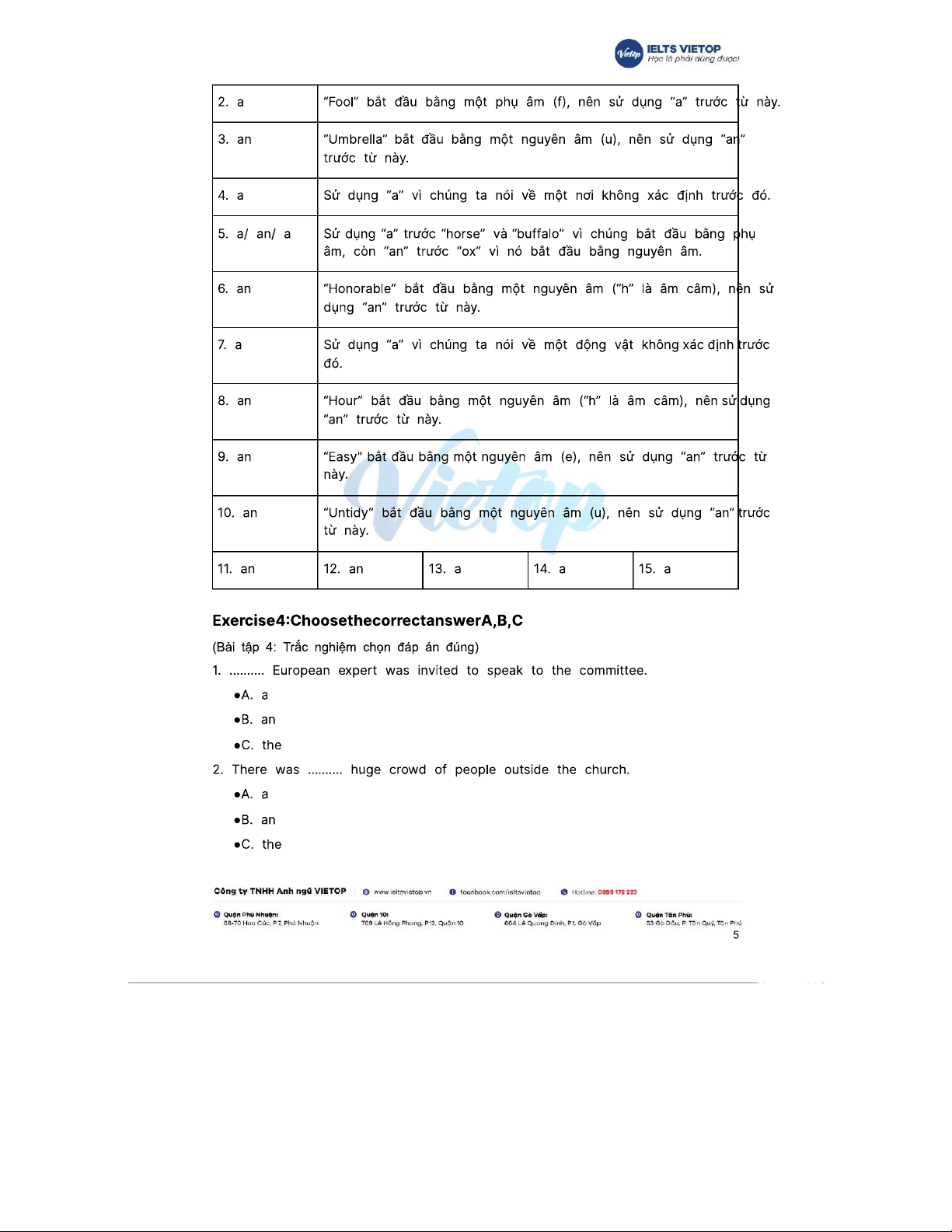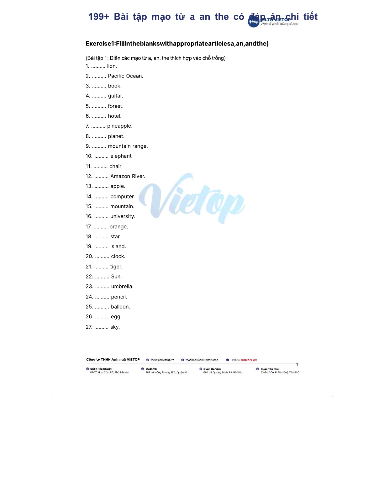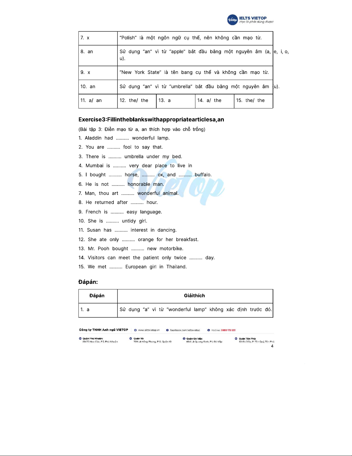 Bài tập 199+ về mạo từ a, an, the và đáp án chi tiết