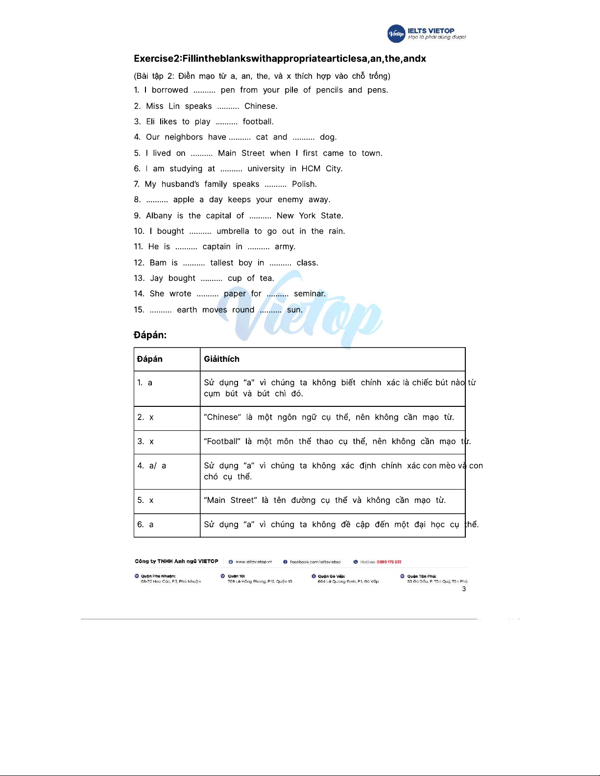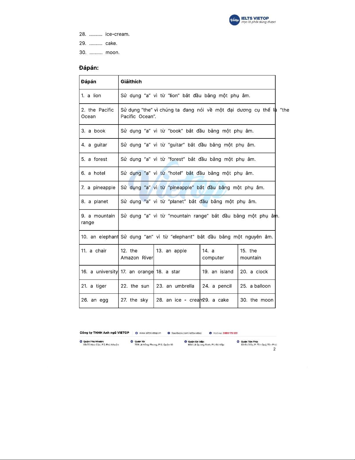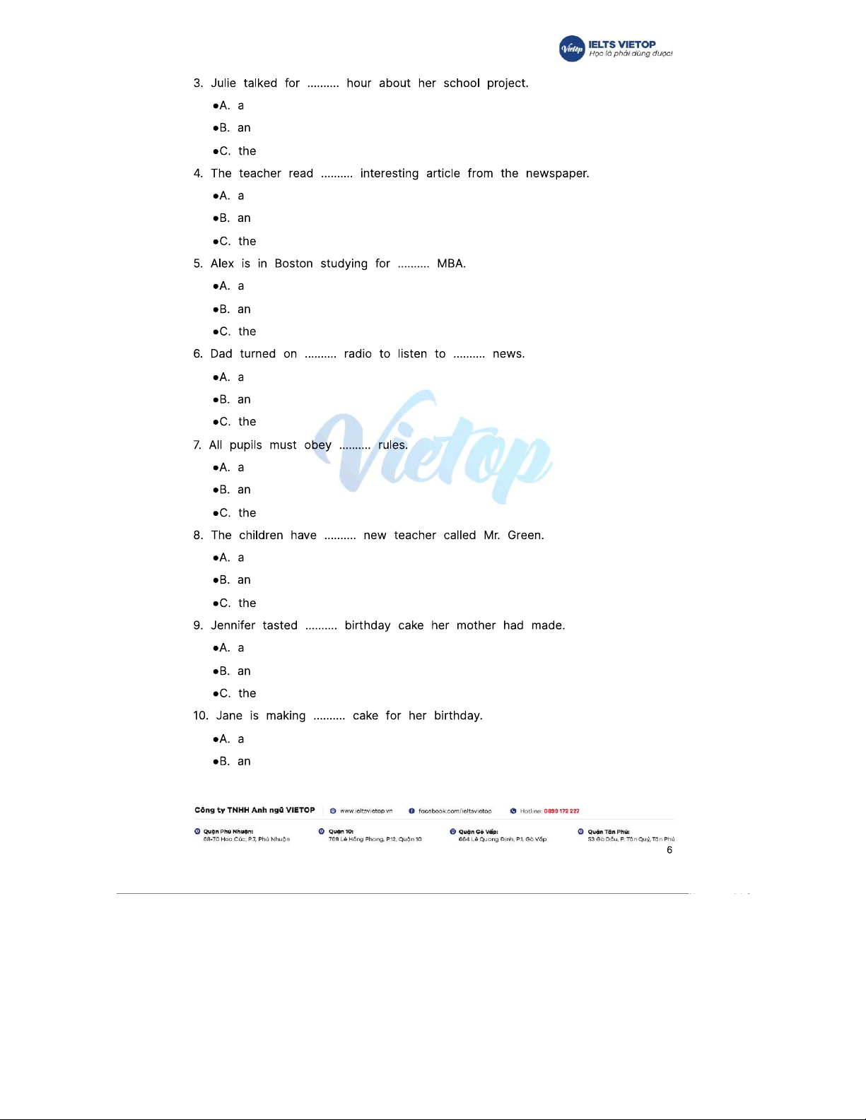 Bài tập 199+ về mạo từ a, an, the và đáp án chi tiết