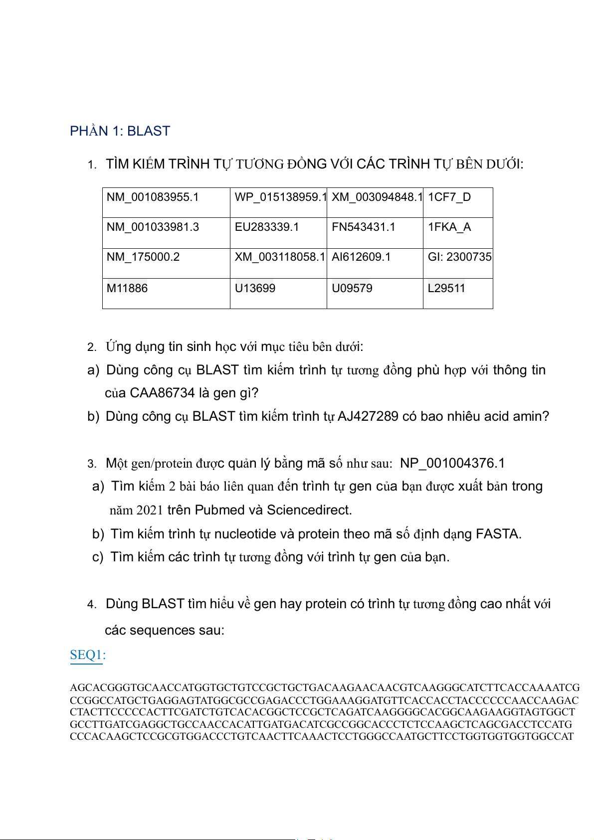 4. Dùng BLAST tìm hiểu về gen hay protein có trình tự tương đồng cao nhất với các sequences sau: SEQ1: