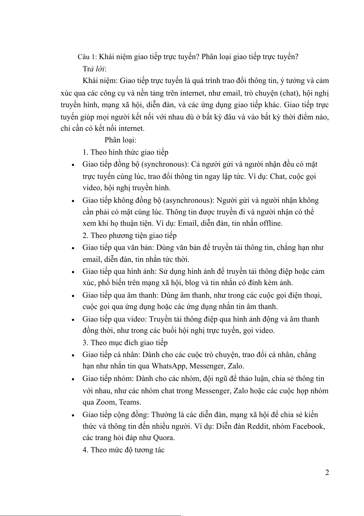 Câu 1: Khái niệm giao tiếp trực tuyến? Phân loại giao tiếp trực tuyến? Trả lời: