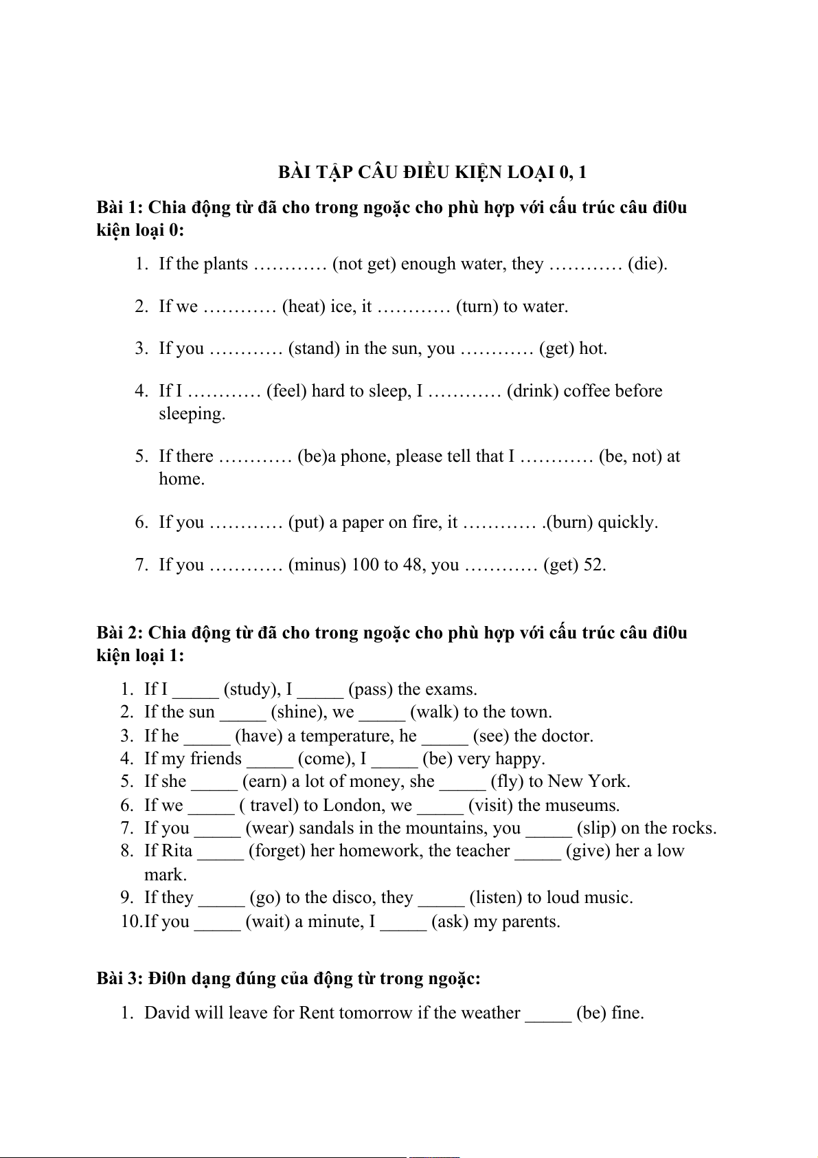 BÀI TẬP CÂU ĐIỀU KIỆN LOẠI 0, 1