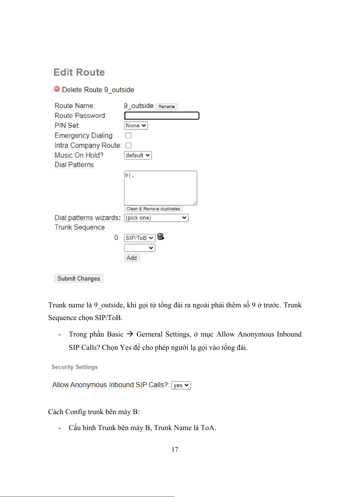 Trunk name là 9_outside, khi gọi từ tổng đài ra ngoài phải thêm số 9 ở trước. Trunk Sequence chọn SIP/ToB. - Trong phần Basic