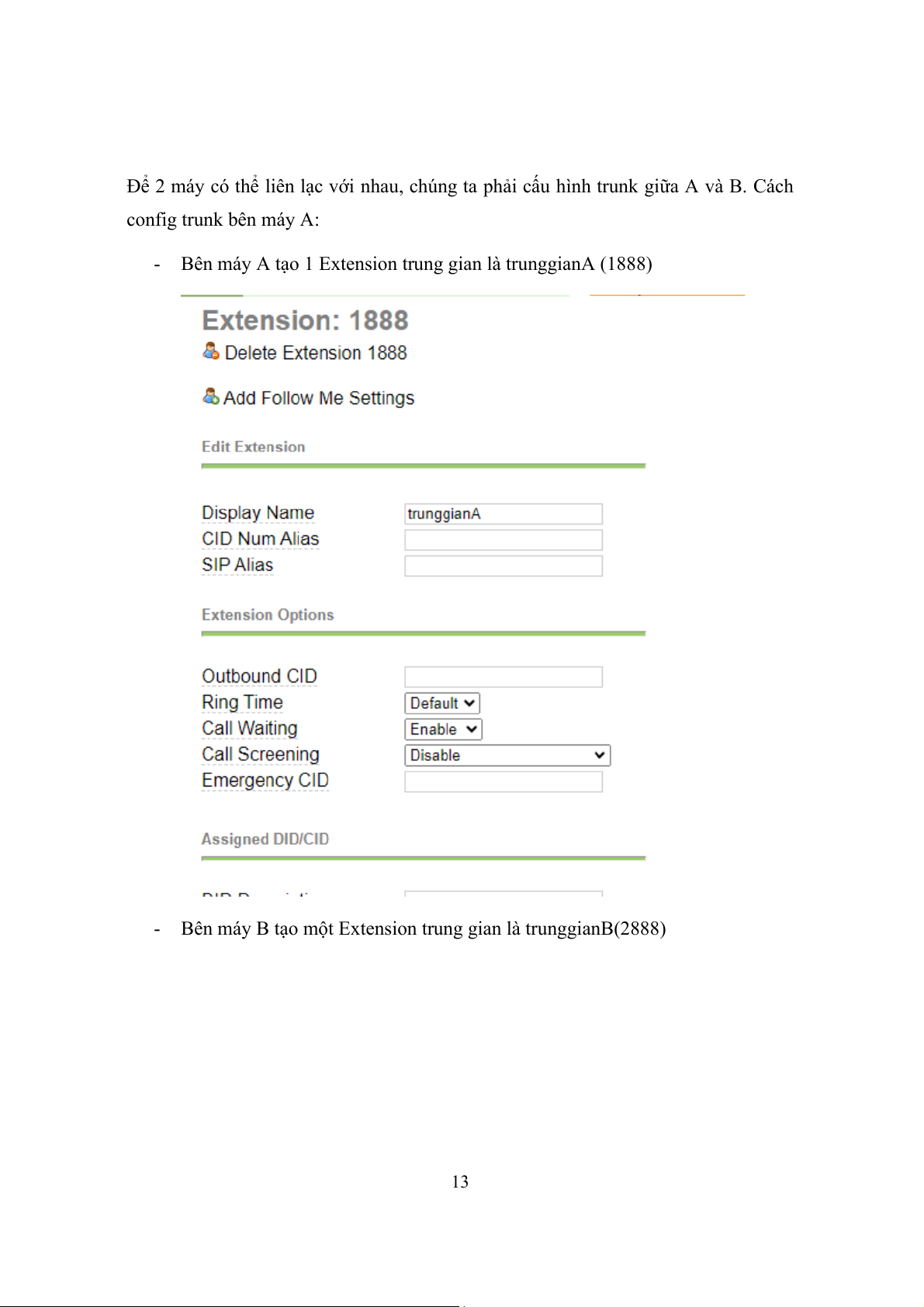 - Bên máy B tạo một Extension trung gian là trunggianB(2888) 13