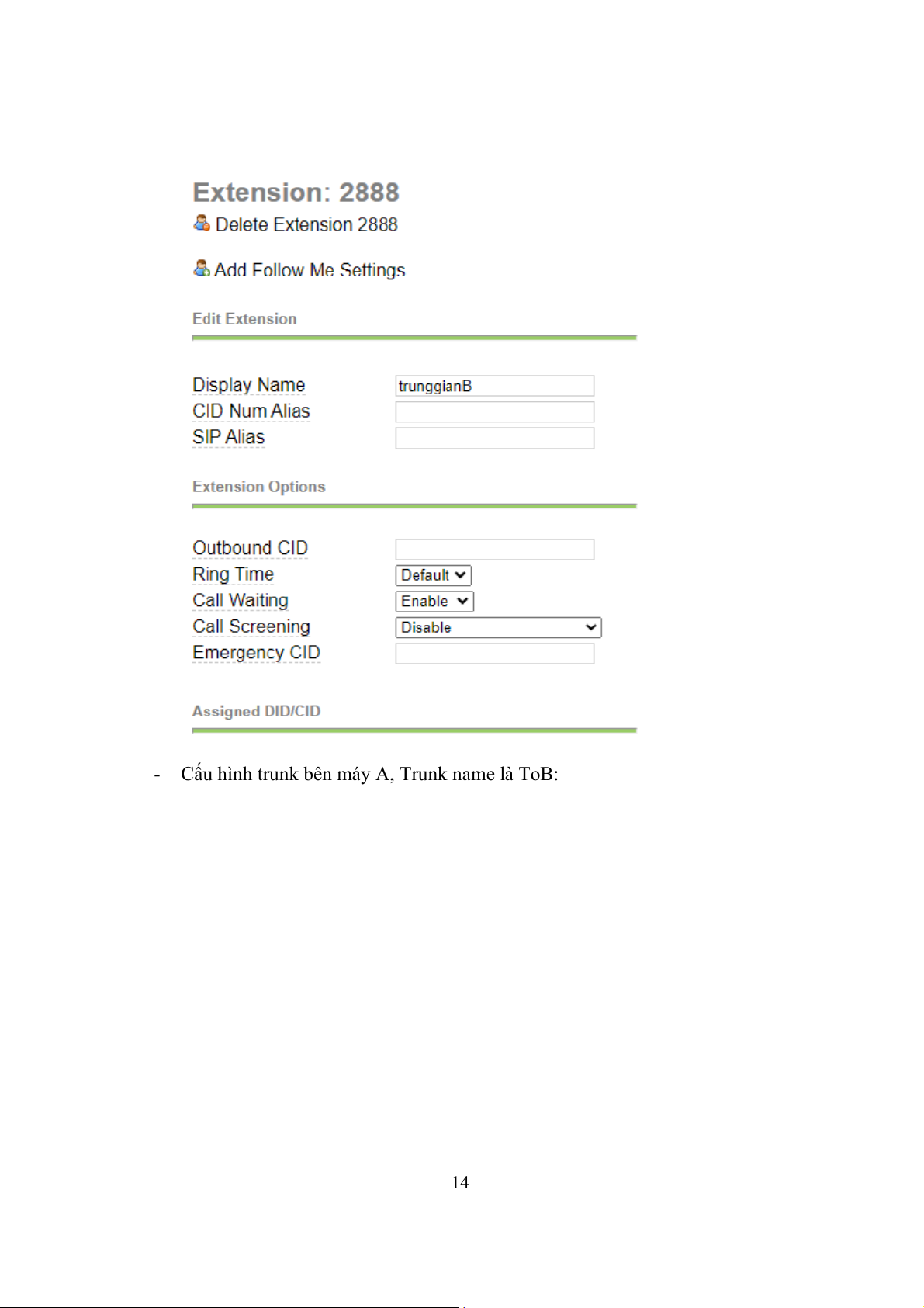 - Cấu hình trunk bên máy A, Trunk name là ToB: 14 15