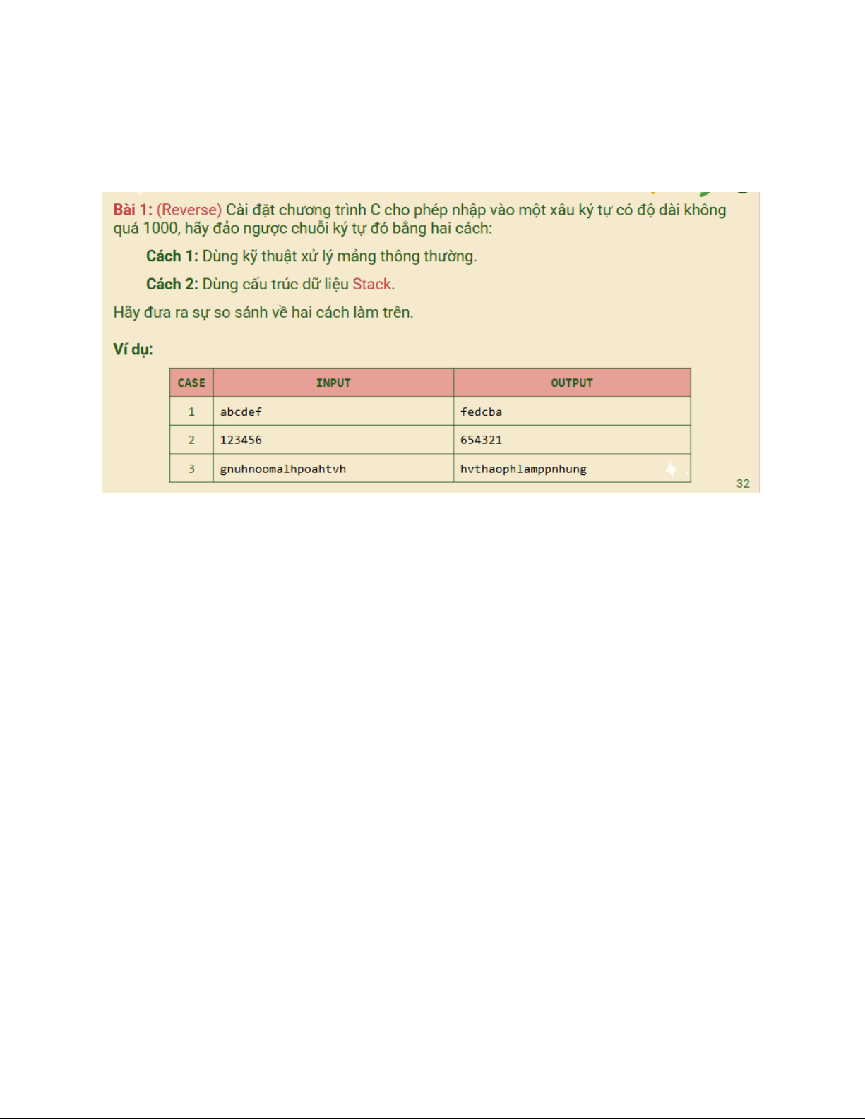 for(int i=0; i<=s->top; i++){ printf("%d ", s->a[i]); } printf("\n"); } //Cau b: #include #include #include #define Max 1000 typedef struct Stack { int a[Max]; int top; } Stack; void initStack(Stack *s){ s->top = -1; } int isEmpty(Stack *s){