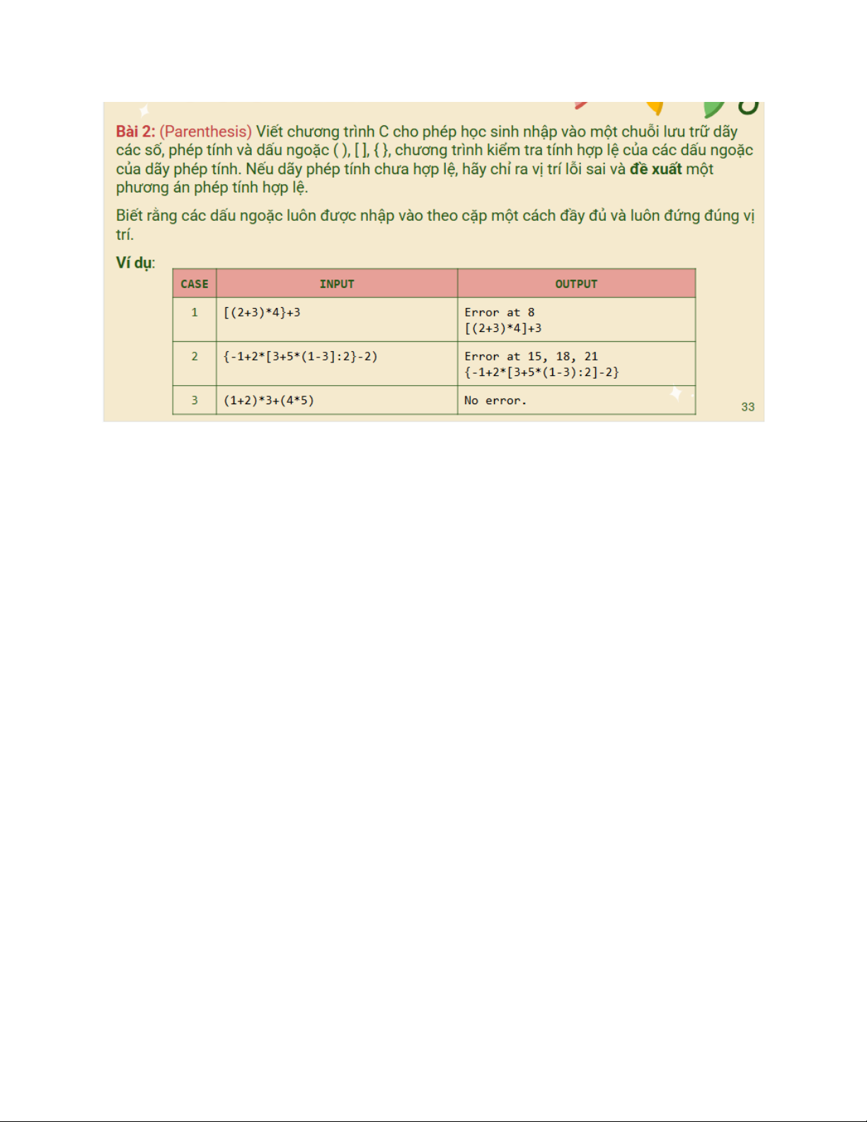 else if(open == '{') expect = '}'; if(c != expect){ errors[count] = i; count++; str[i] = expect; } } } if(count == 0){ printf("No error.\n"); } else { printf("Error at");