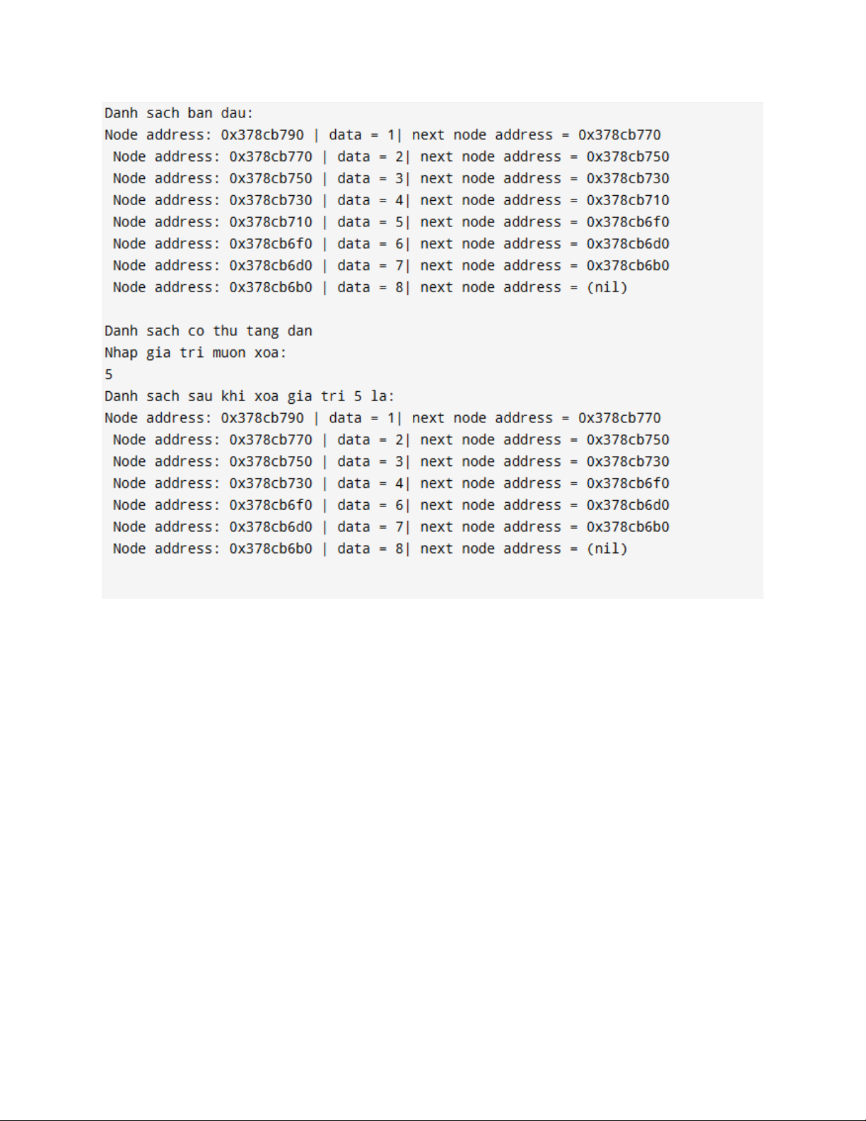// Giải phóng bộ nhớ node k free(nodeToDelete); } //Hàm main int main(){ LinkedList list; init(&list);