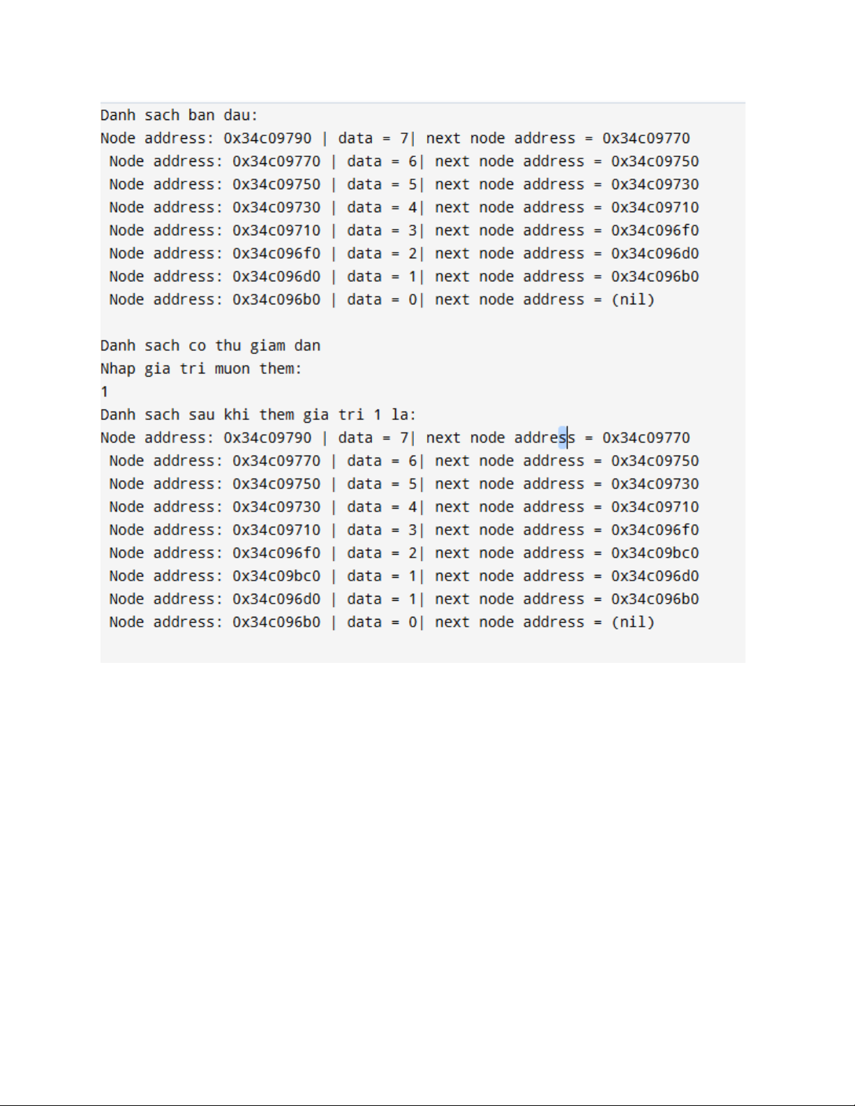 printf("Danh sach sau khi them gia tri %d la: \n", val); printList(&list); }