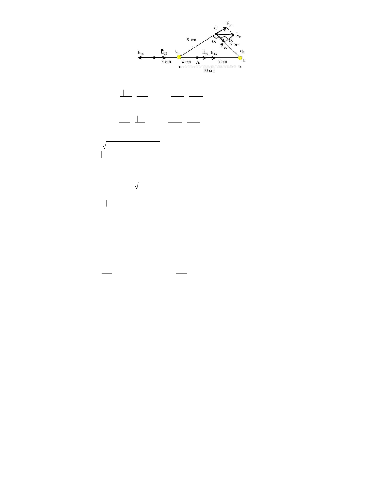 Tại điểm C: E và E có chiều nhau như hình vẽ. 1C 2C Ta có: 2 2 E E E 2E E cos , trong đó: C 1C 2C 1C 2C 8 q8.10 8 q3.10 19 3 E k 9.10 . 88,9.10 V / m và 29 3 E k 9.10 . 55,1.10 V / m 1C 2 2 MC 0,09 2C 2 2 NC 0,07 2 2 2 2 2 2 MC NC MN 9 7 10 5 cos , 0 76, 2 2MC.NC 2.9.7 21 Thay vào ta được: 3 2 2 3 E 10 88,9 55,1