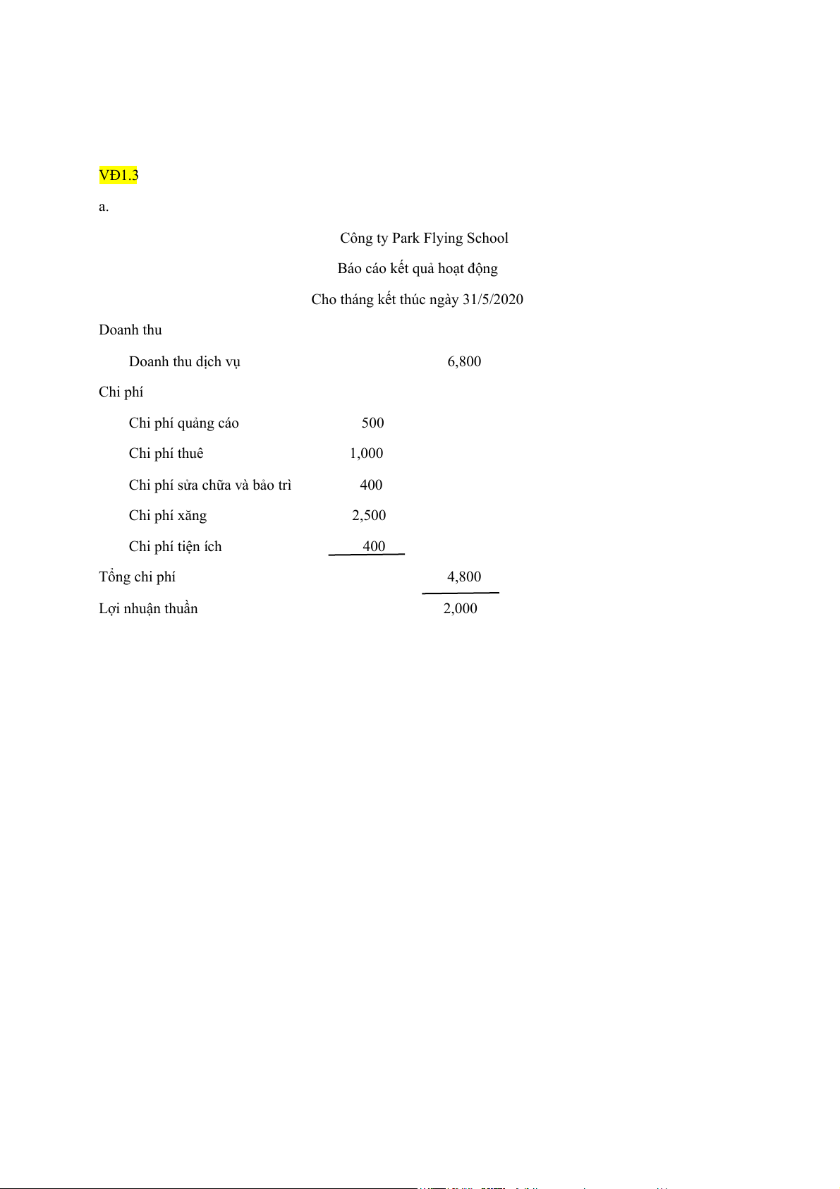 Cho tháng kết thúc ngày 31/5/2020 Doanh thu Doanh thu dịch vụ 6,800 Chi phí Chi phí quảng cáo 500 Chi phí thuê 1,000