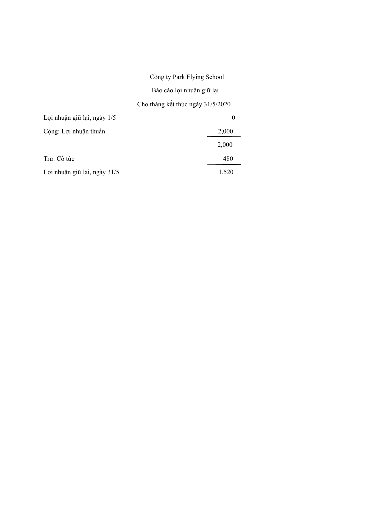 Lợi nhuận giữ lại, ngày 1/5 0 Cộng: Lợi nhuận thuần 2,000 2,000 Trừ: Cổ tức 480
