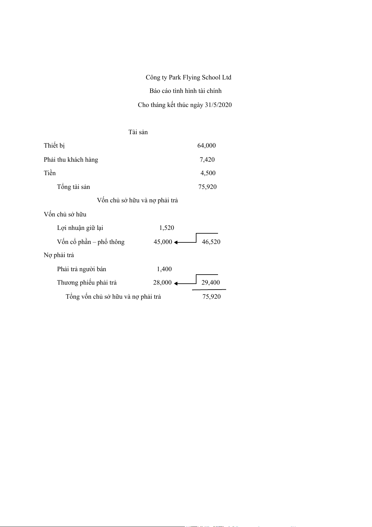 Tổng vốn chủ sở hữu và nợ phải trả 75,920 b. Công ty Park Flying School