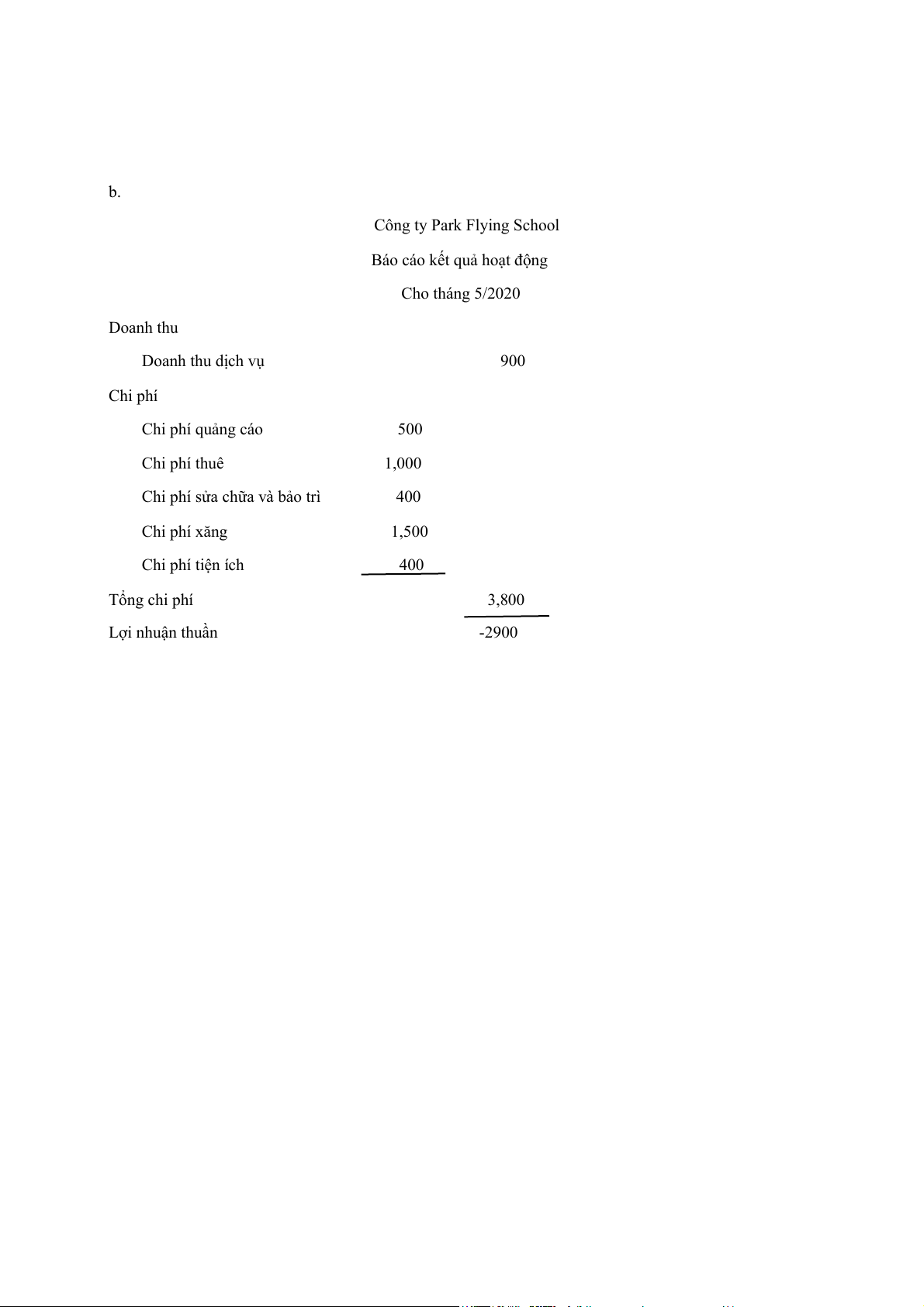 Chi phí sửa chữa và bảo trì 400 Chi phí xăng 1,500 Chi phí tiện ích 400 Tổng chi phí 3,800 Lợi nhuận thuần -2900 Công ty Park Flying School