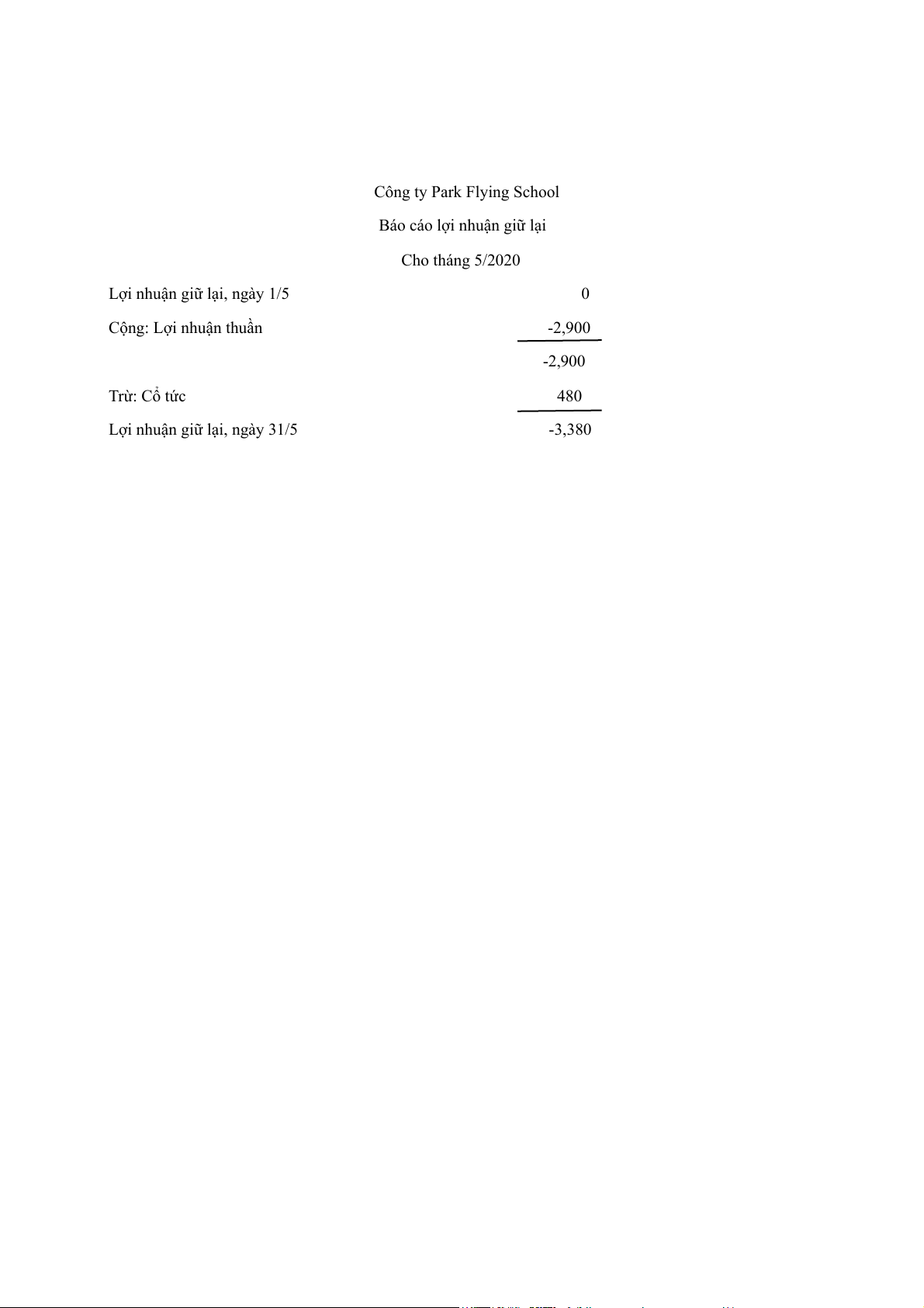 Lợi nhuận giữ lại, ngày 1/5 0 Cộng: Lợi nhuận thuần -2,900 -2,900 Trừ: Cổ tức 480