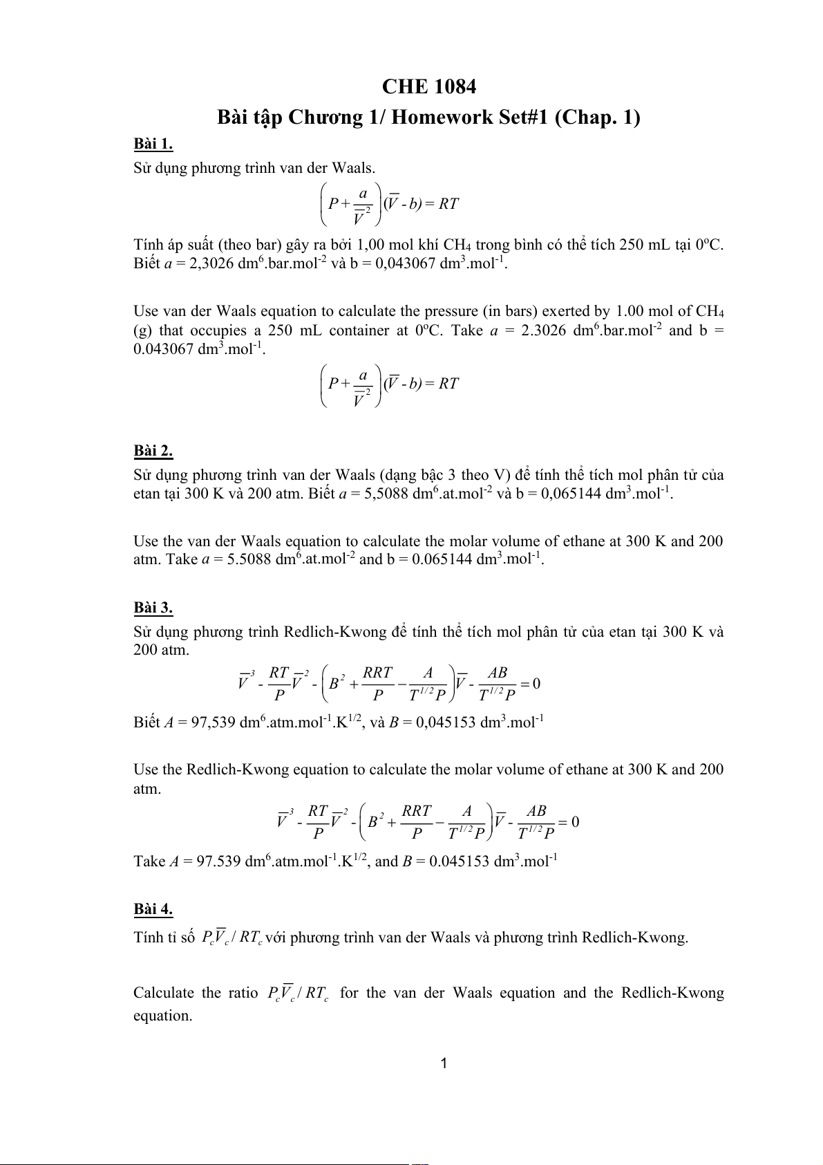 Calculate the ratio P V / RT for the van der Waals equation and the Redlich-Kwong c c c equation. 1 Bài 5.