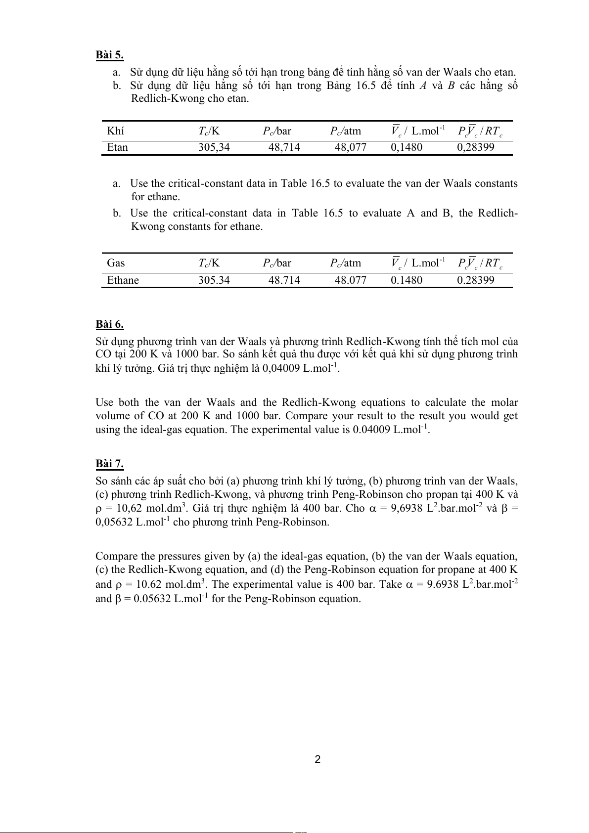 atm. Take a = 5.5088 dm6.at.mol-2 and b = 0.065144 dm3.mol-1. Bài 3.