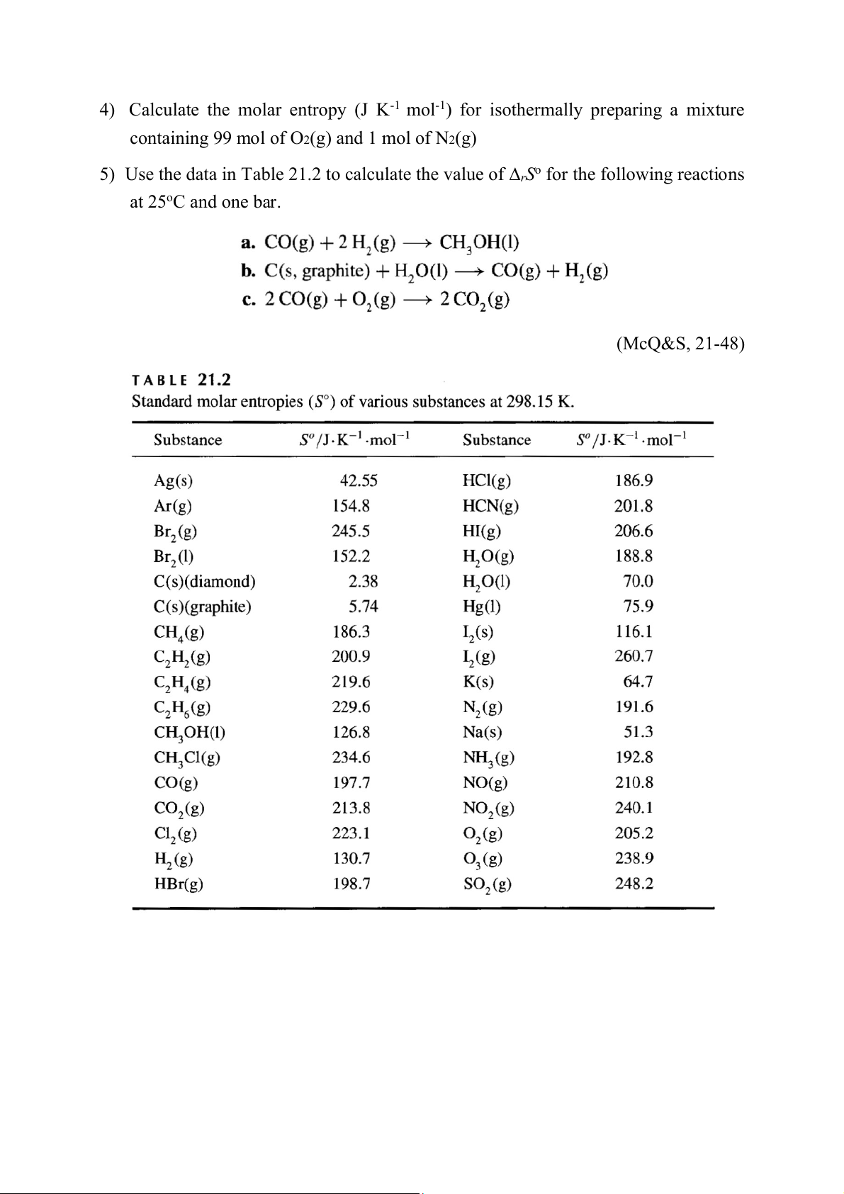 5) Use the data in Table 21.2 to calculate the value of ∆rSo for the following reactions at 25oC and one bar. (McQ&S, 21-48) Chem 1084 Homework Set #6 1)