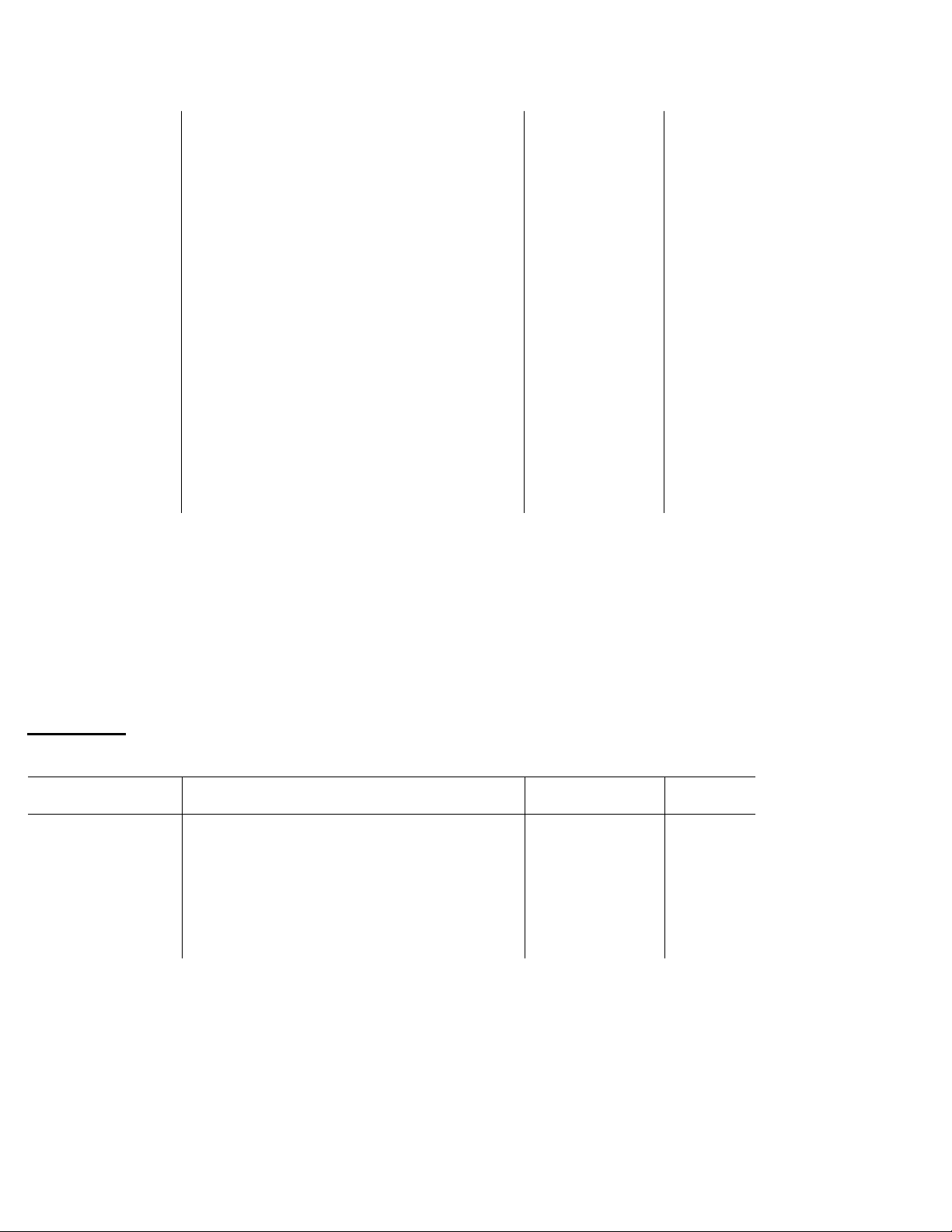 Không ghi chép vì không phải là một giao dịch lOMoAR cPSD| 58797173 3 Tiền thuê trả trước 24,000 Tiền 24,000 4 30,000 Thiết bị Tiền 10,000 Phải trả người bán 20,000 5 1,800 Bảo hiểm trả trước Tiền 1,800 lOMoAR cPSD| 58797173 6 Vật tư 420 420 Tiền 7 Vật tư 1,500 Phải trả người bán 8 Tiền 20,000 Phải thu khách hàng Doanh thu dịch vụ 9 400 Phải trả người bán Tiền 10 3,000 Tiền 11 Phải thu khách hàng 380 Chi phí tiện ích 12 Phải trả người bán 6,100 1,500 8,000 12,000 400 3,000 380 6,100 lOMoAR cPSD| 58797173