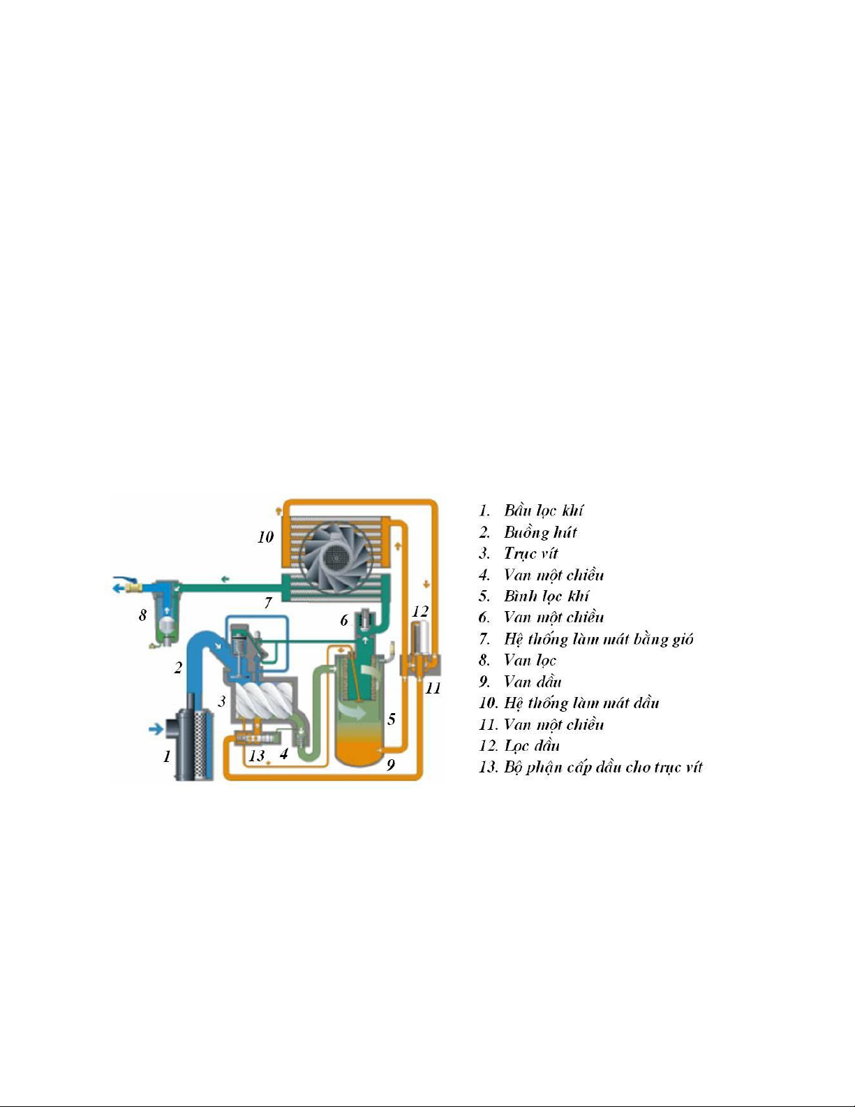 2. Nguyên lý làm việc máy nén khí trục vít một cấp có hệ thống cấp dầu bôi trơn.