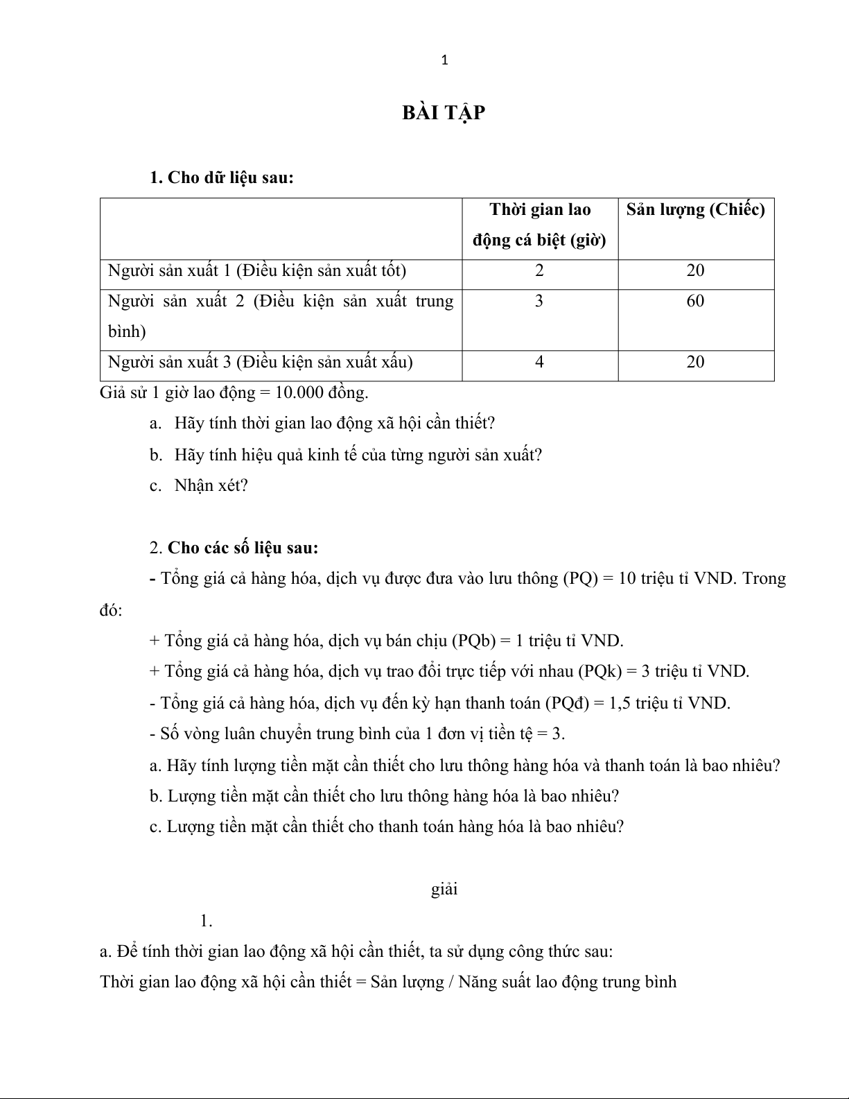 Thời gian lao động xã hội cần thiết của người sản xuất 1 = 20 / 10 = 2 giờ - Người sản xuất 2: