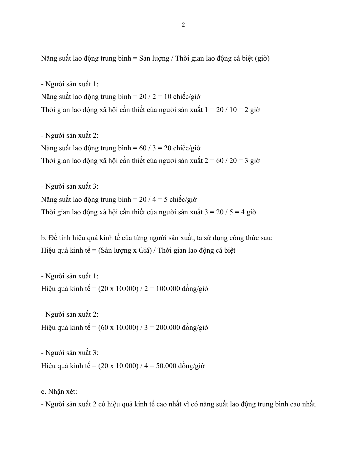 - Người sản xuất 2 có hiệu quả kinh tế cao nhất vì có năng suất lao động trung bình cao nhất. 3