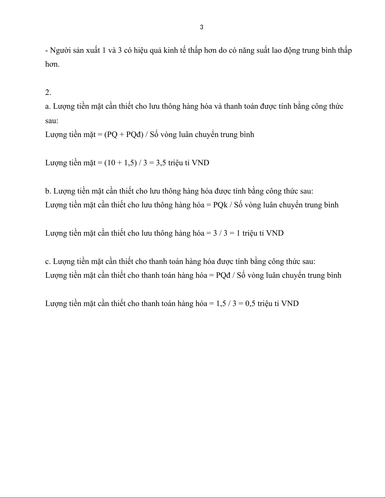 Lượng tiền mặt cần thiết cho lưu thông hàng hóa = 3 / 3 = 1 triệu tỉ VND