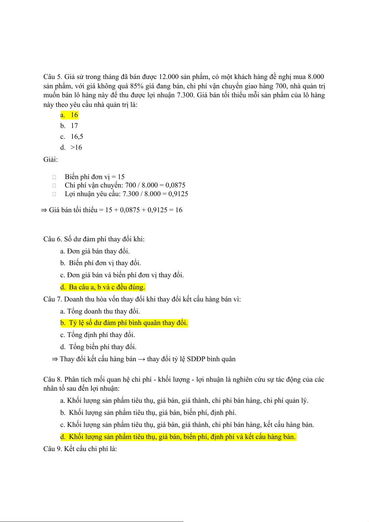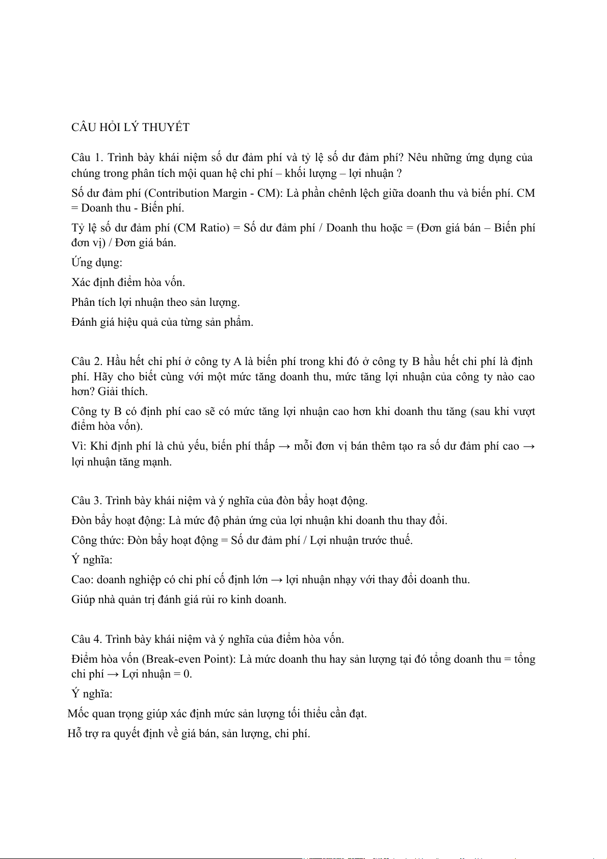 Câu 8. Phân tích mối quan hệ chi phí - khối lượng - lợi nhuận là nghiên cứu sự tác động của các
