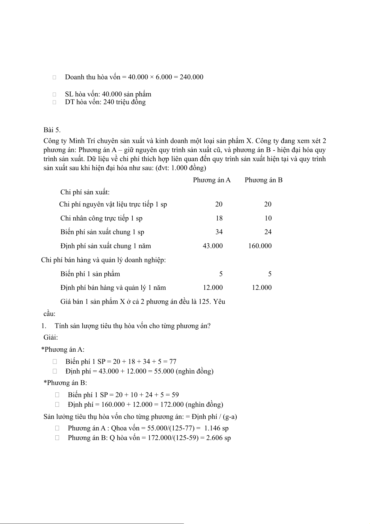 Phương án A : Qhoa vốn = 55.000/(125-77) = 1.146 sp