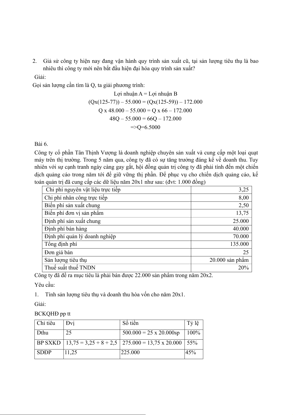 48Q – 55.000 = 66Q – 172.000 =>Q=6.5000 Bài 6.
