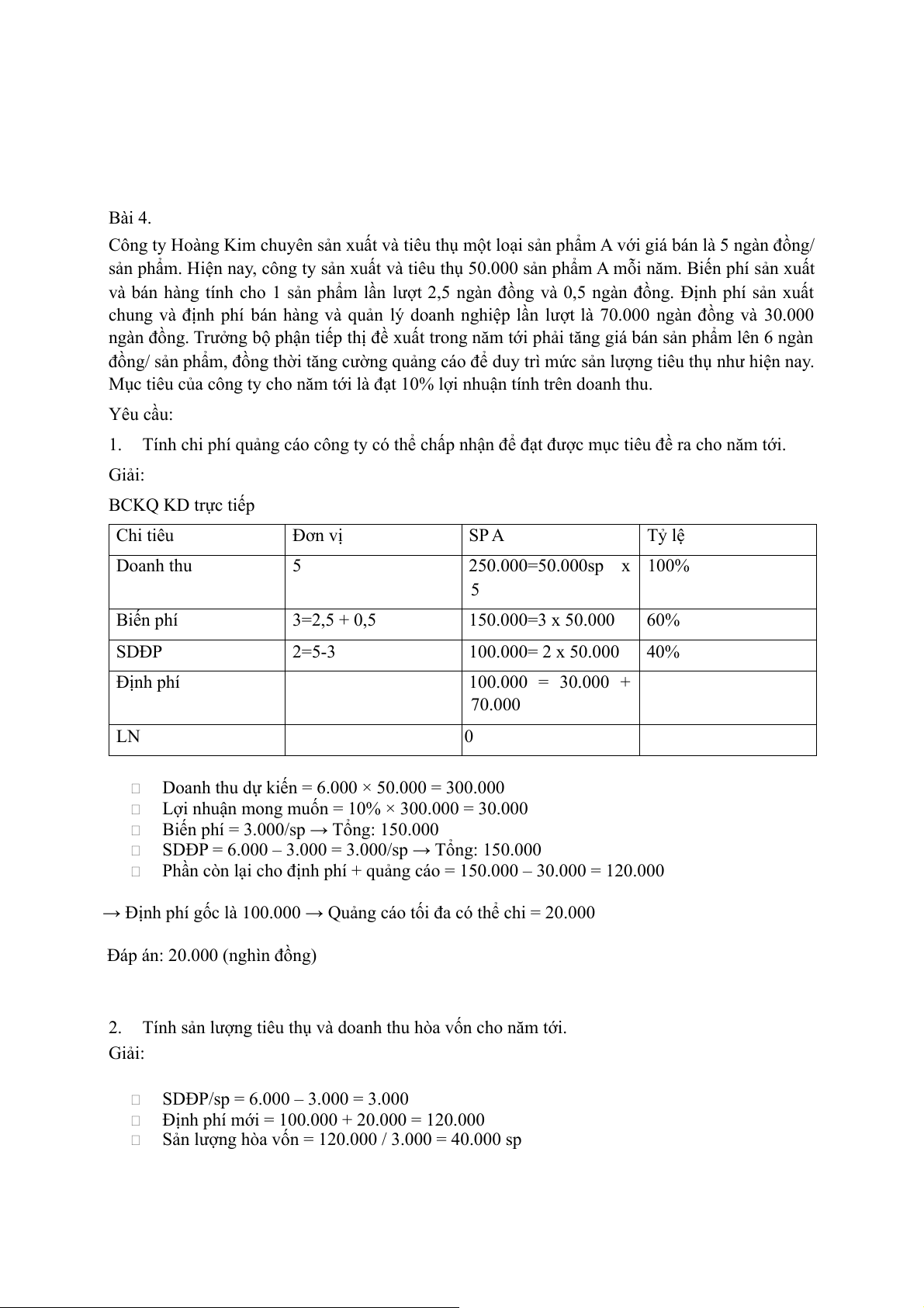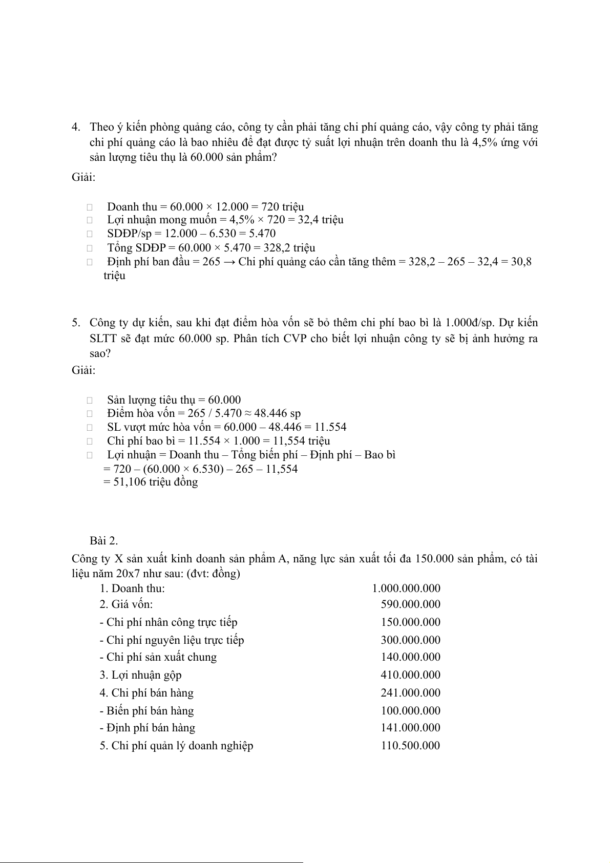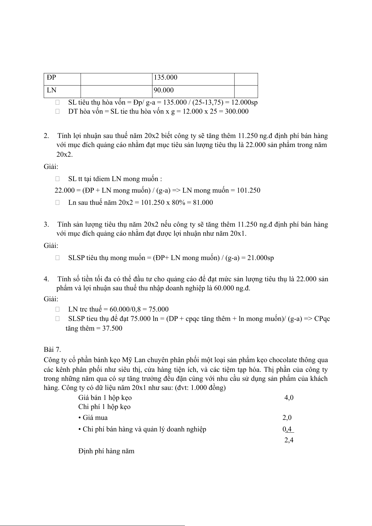 SLSP tieu thụ để đạt 75.000 ln = (DP + cpqc tăng thêm + ln mong muốn)/ (g-a) => CPqc tăng thêm = 37.500 Bài 7.