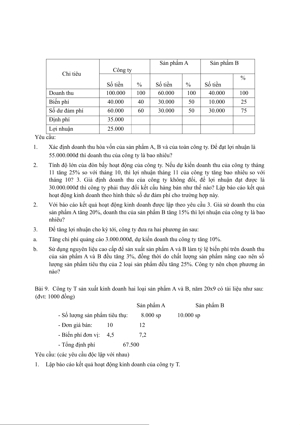 Bài 9. Công ty T sản xuất kinh doanh hai loại sản phẩm A và B, năm 20x9 có tài liệu như sau: (đvt: 1000 đồng) Sản phẩm A Sản phẩm B