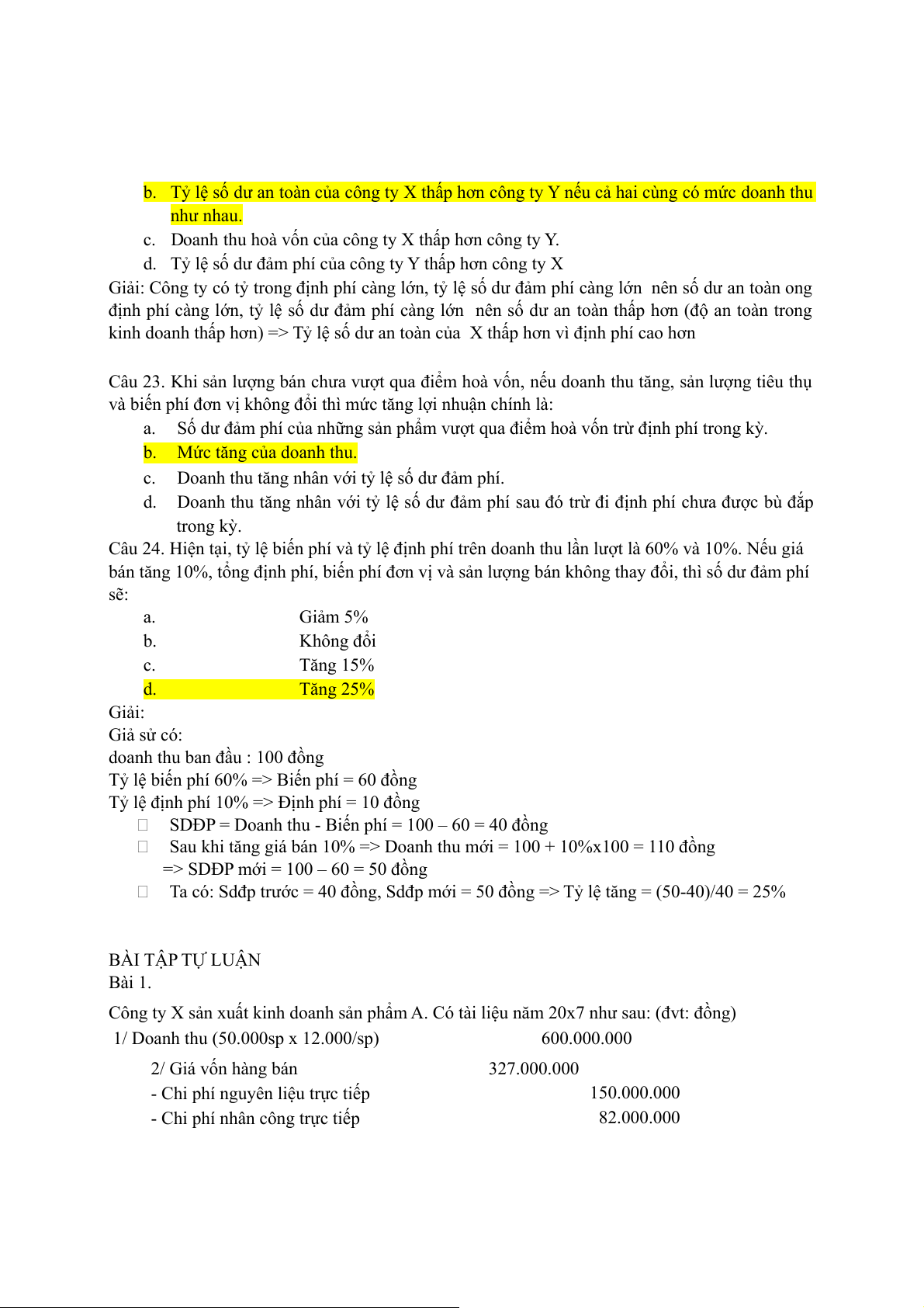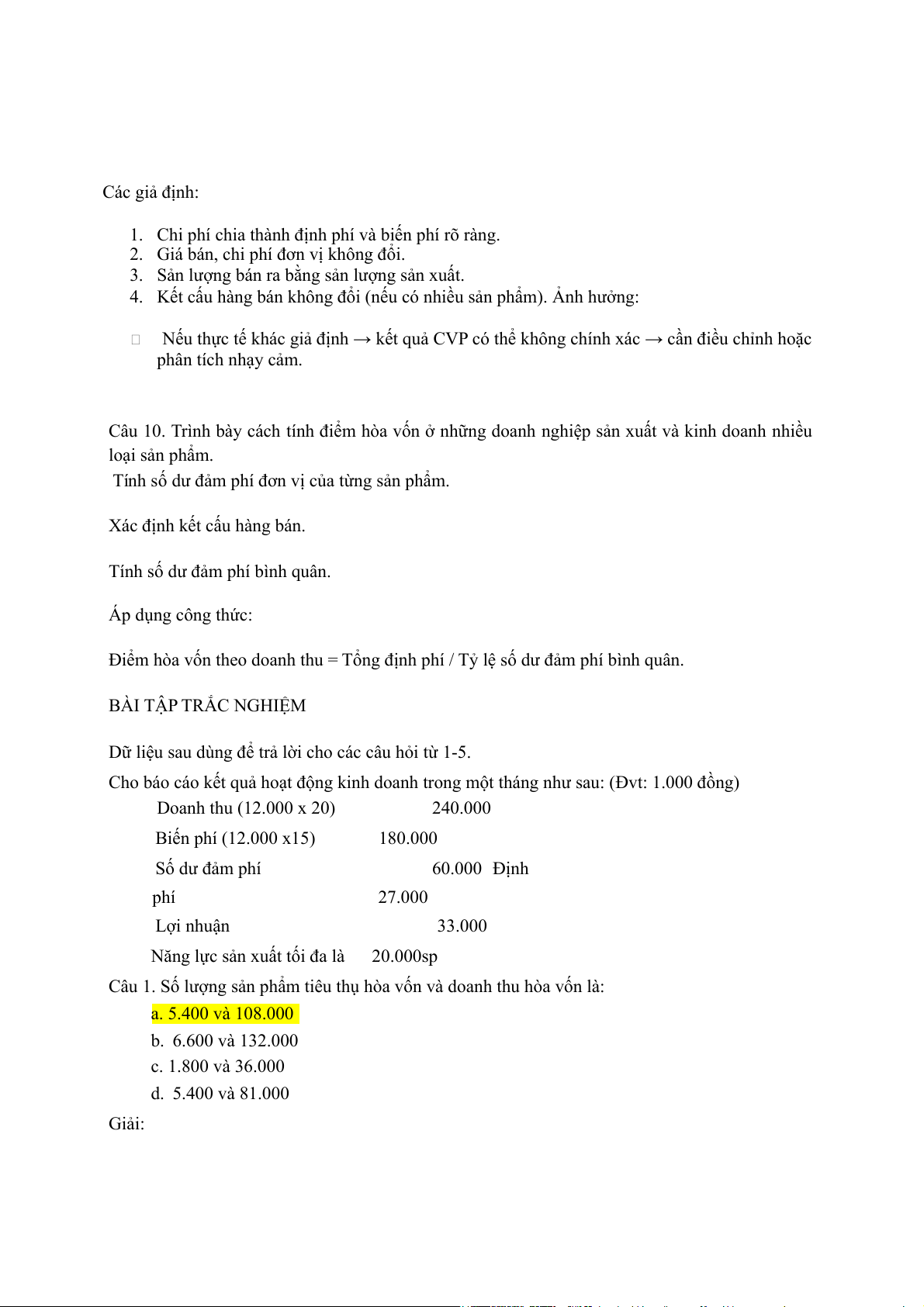 Câu 1. Số lượng sản phẩm tiêu thụ hòa vốn và doanh thu hòa vốn là: a. 5.400 và 108.000 b. 6.600 và 132.000 c. 1.800 và 36.000 d. 5.400 và 81.000 Giải: