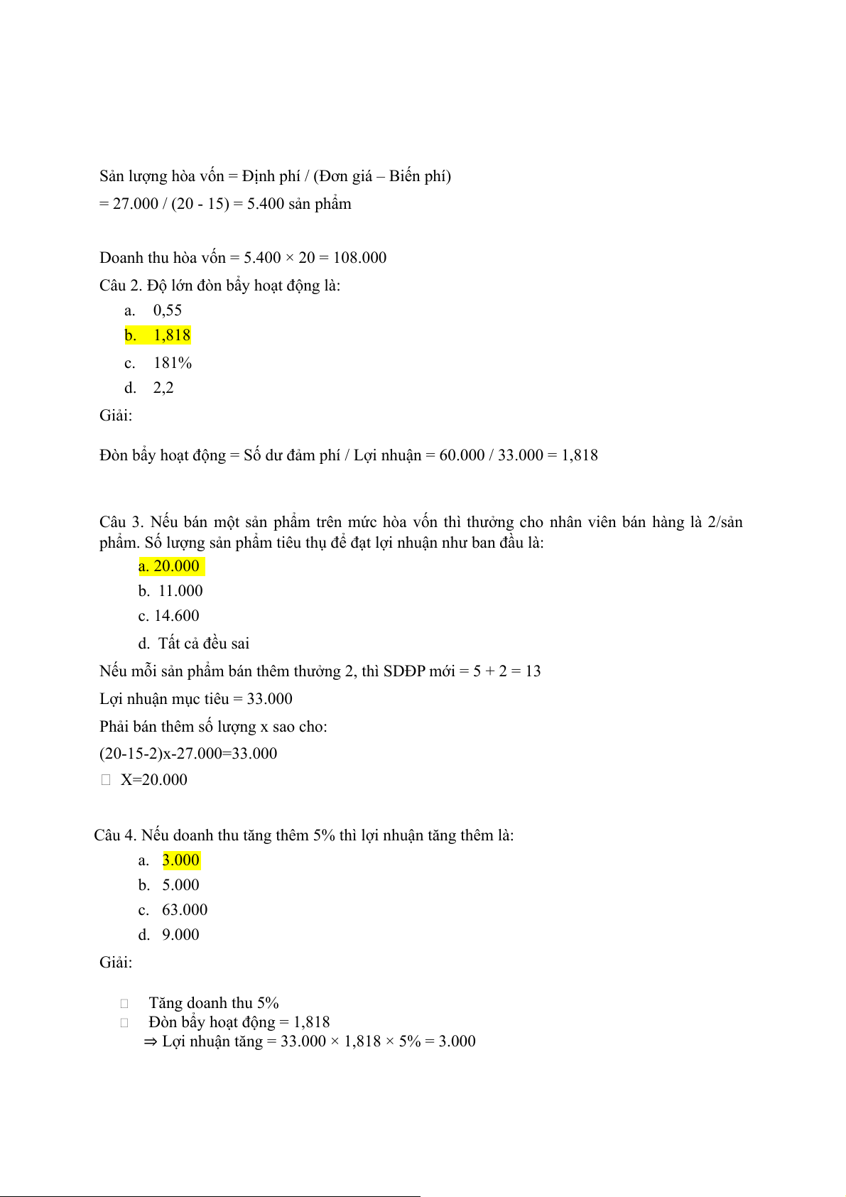 Câu 4. Nếu doanh thu tăng thêm 5% thì lợi nhuận tăng thêm là: a. 3.000 b. 5.000 c. 63.000 d. 9.000 Giải: Tăng doanh thu 5%