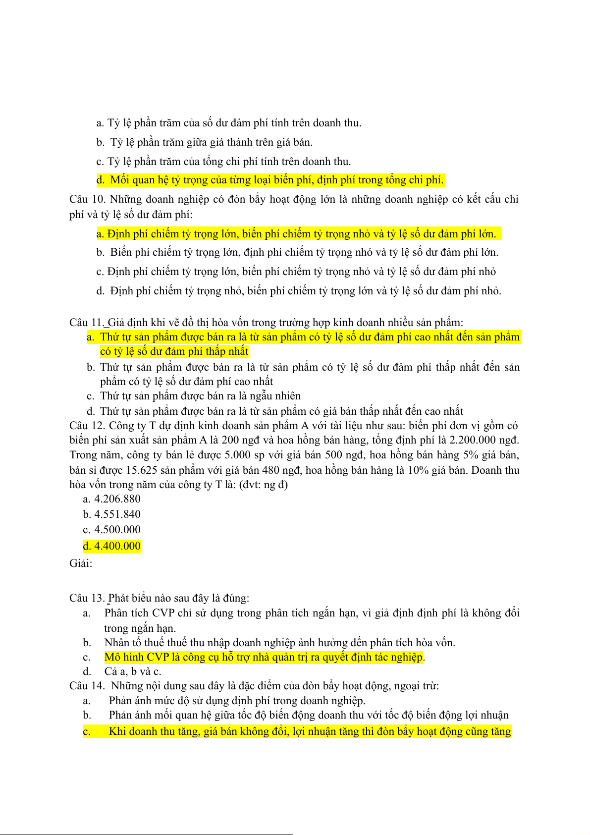 Câu 10. Trình bày cách tính điểm hòa vốn ở những doanh nghiệp sản xuất và kinh doanh nhiều loại sản phẩm.