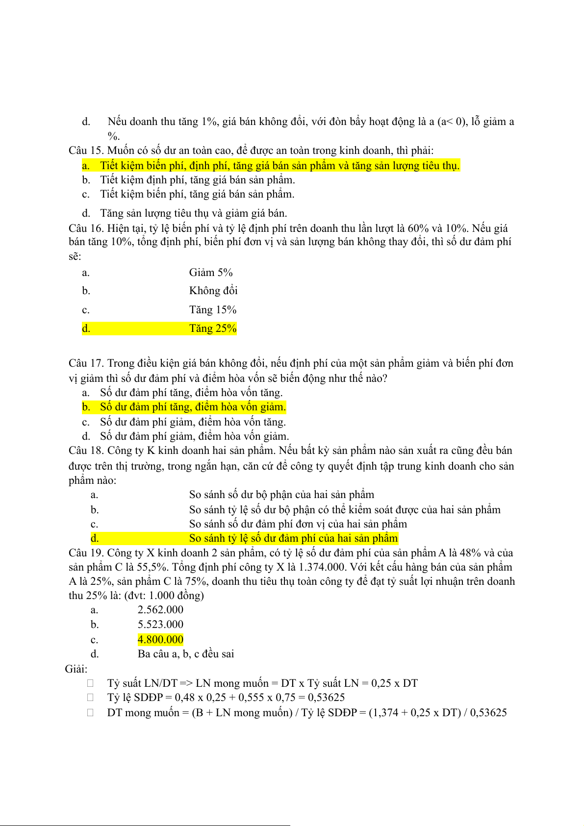 này theo yêu cầu nhà quản trị là: a. 16 b. 17 c. 16,5 d. >16 Giải: Biến phí đơn vị = 15