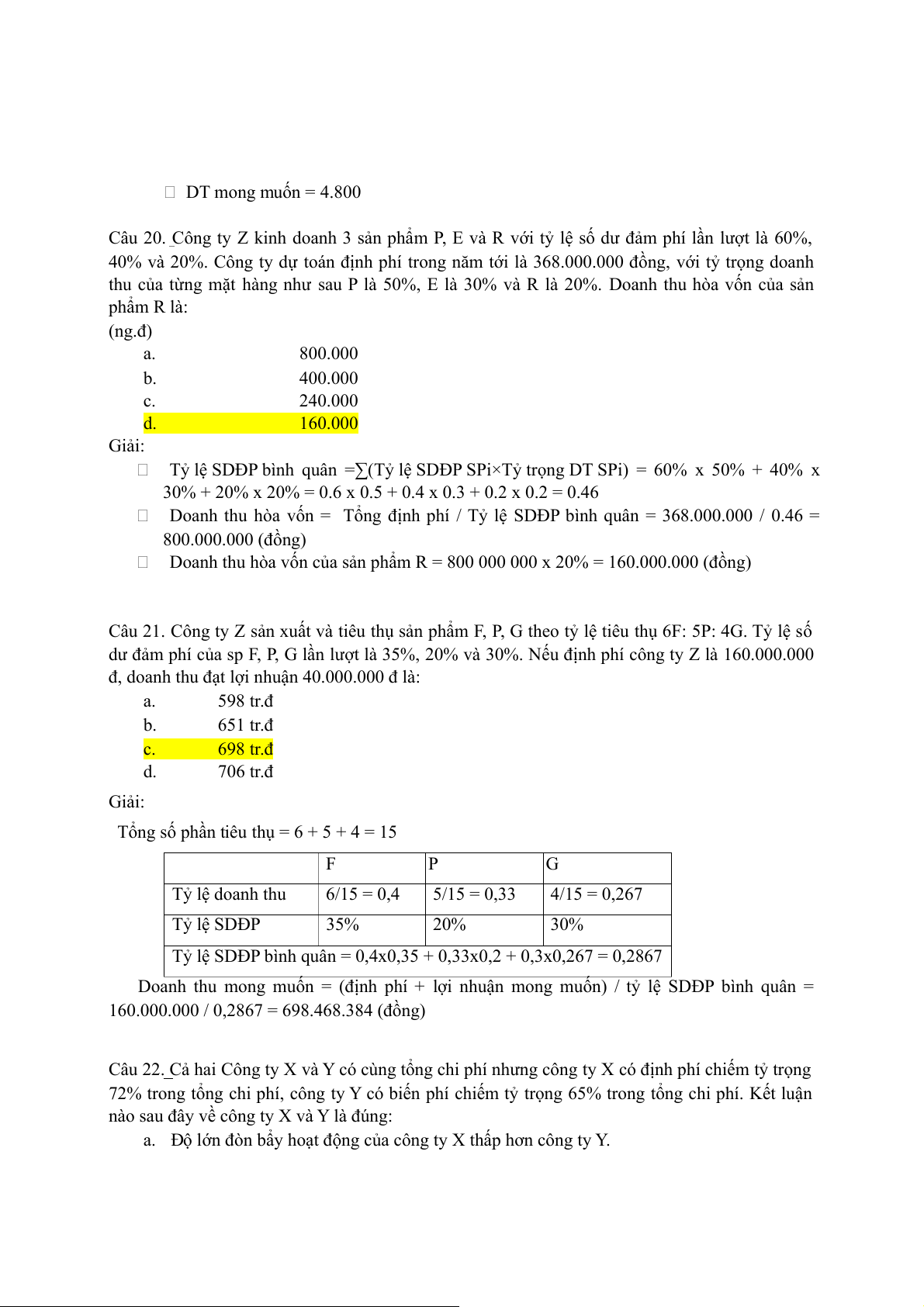 phẩm. Số lượng sản phẩm tiêu thụ để đạt lợi nhuận như ban đầu là: a. 20.000 b. 11.000 c. 14.600 d. Tất cả đều sai