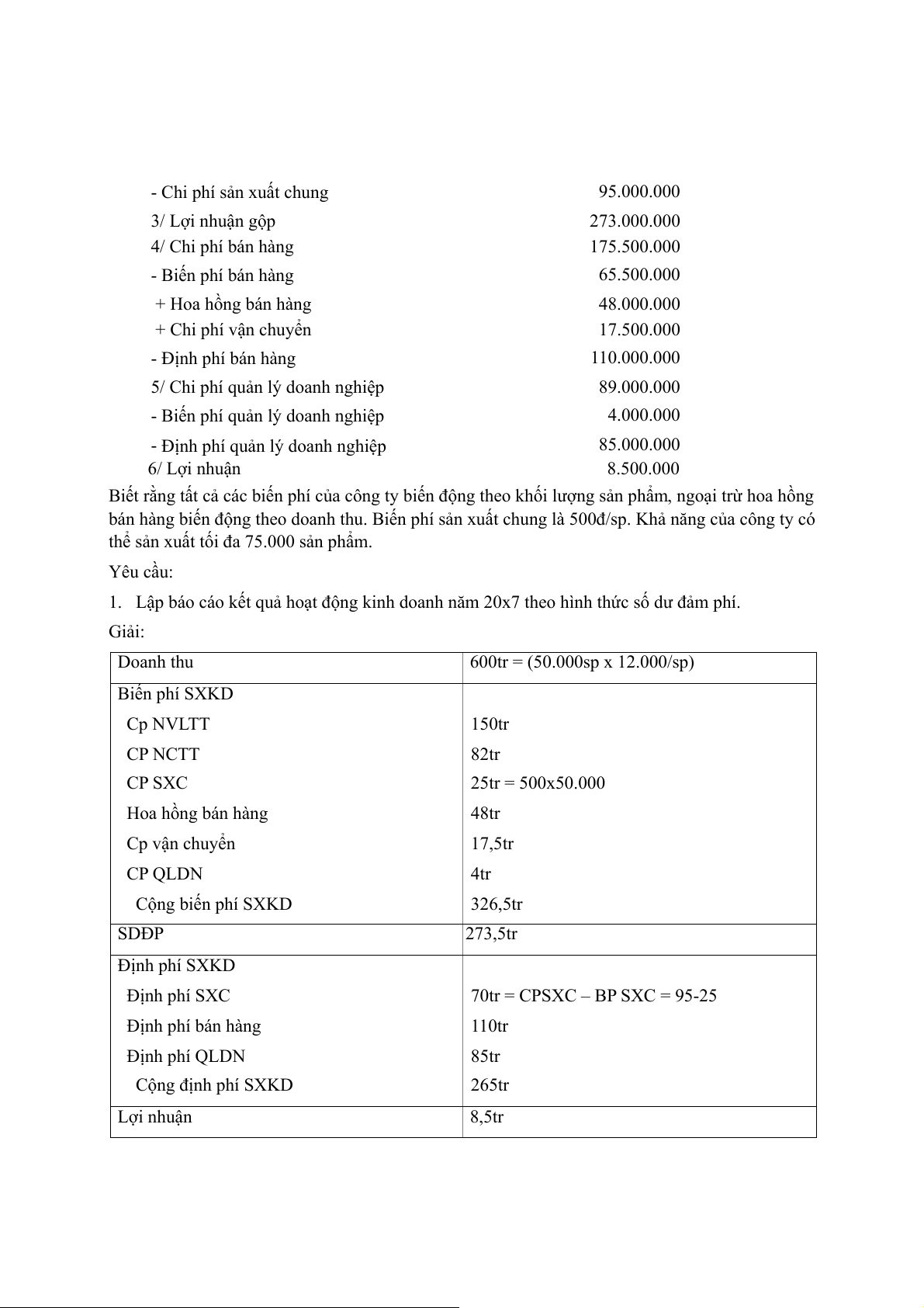 DT cần đạt = (ĐP + LN mong muốn)/ tỷ lệ SDĐP= (440.000+184.000)/ 32,5%= 1.920.000 Bài 8.